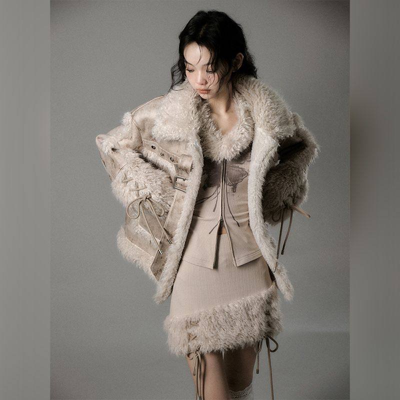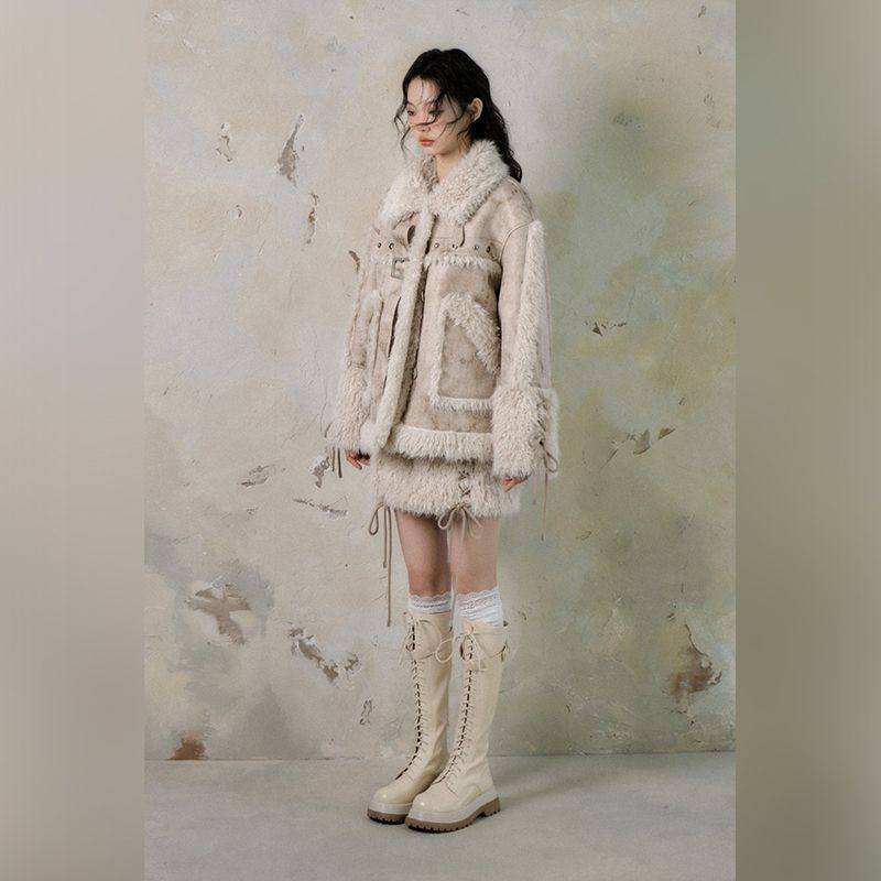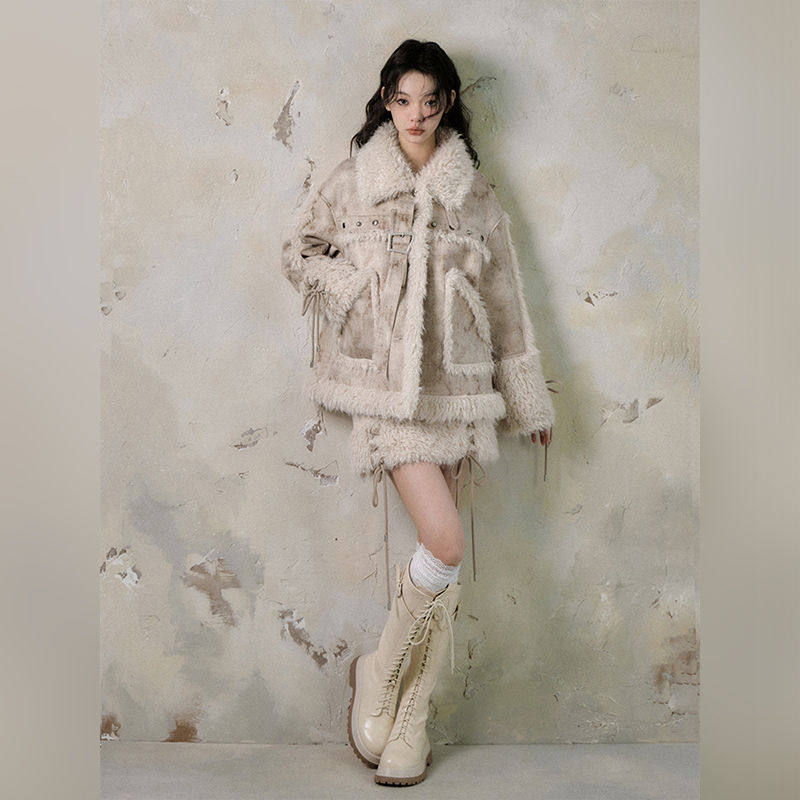 【荒木以序】冬季复古小众设计感皮毛一体外套半身裙套装两件套女