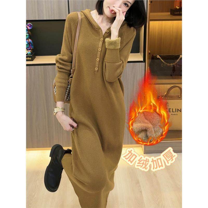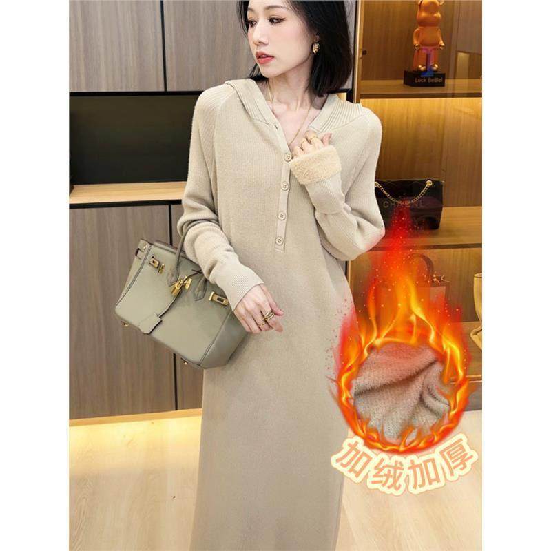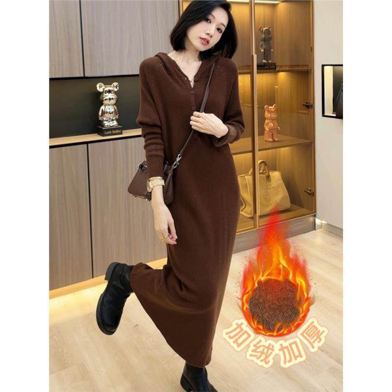 欧洲站连帽加厚打底针织连衣裙女2025年新款秋宽松洋气内搭毛衣裙
