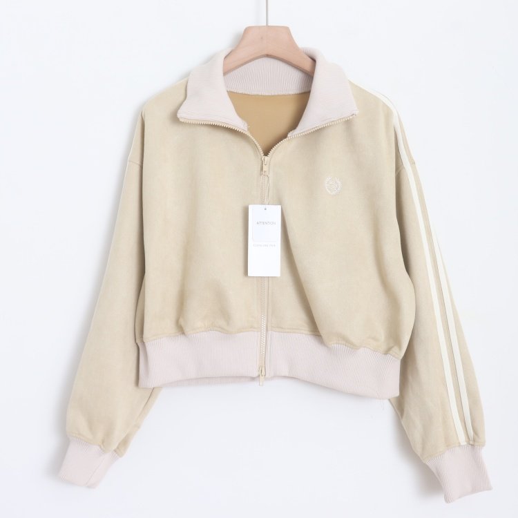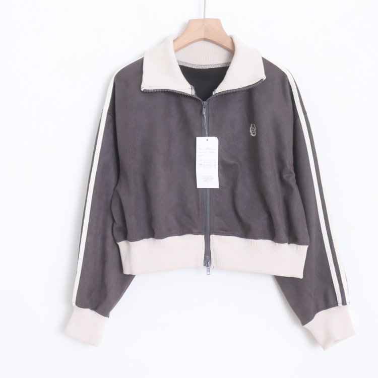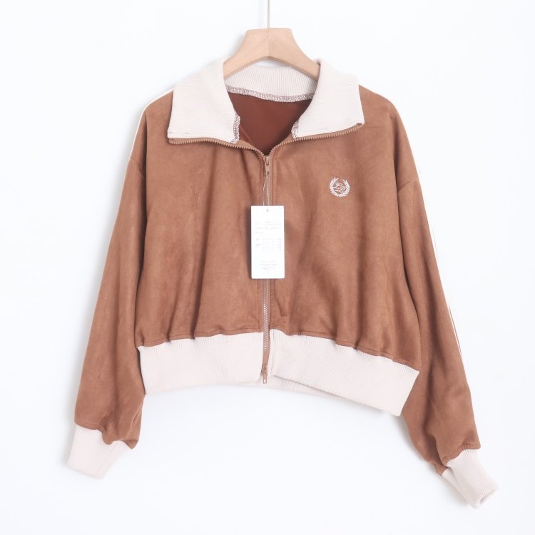 首页> 女装> D16008日单新款双头拉链螺纹领宽松显瘦女撞色休闲短款麂皮绒外套