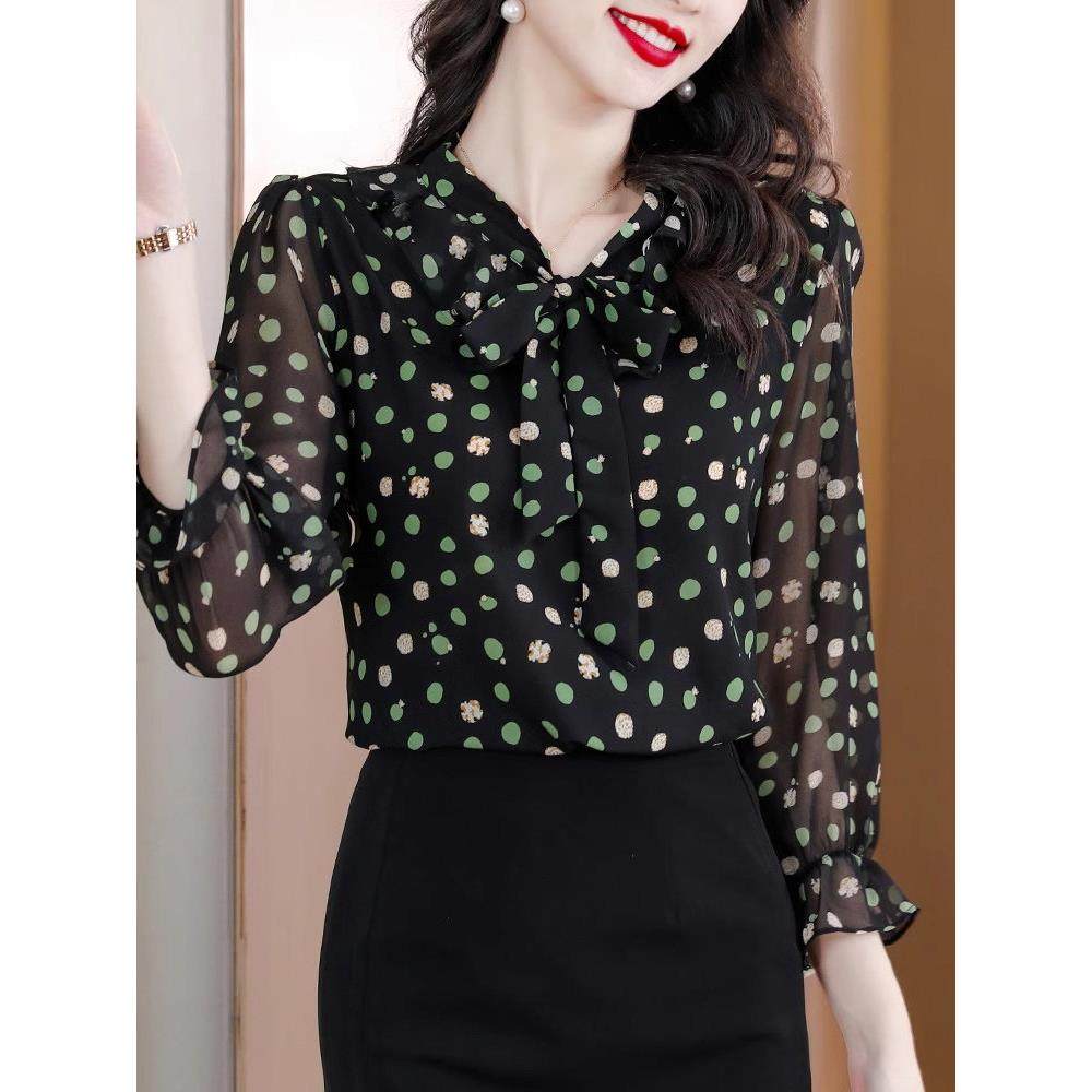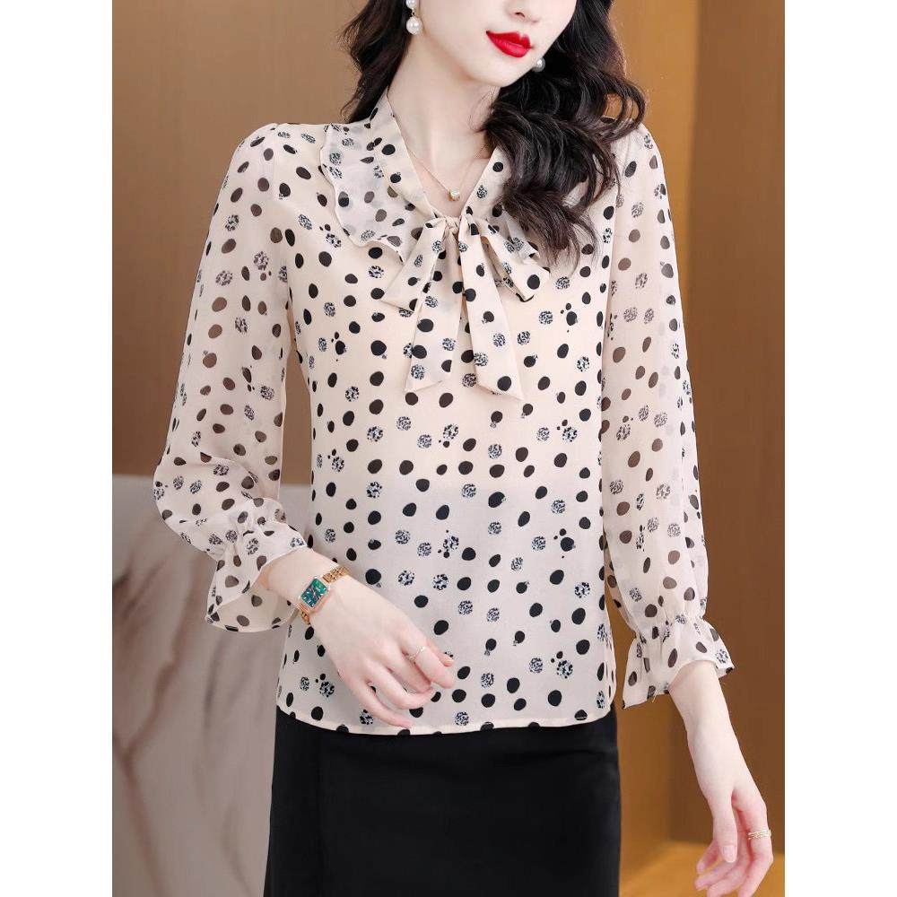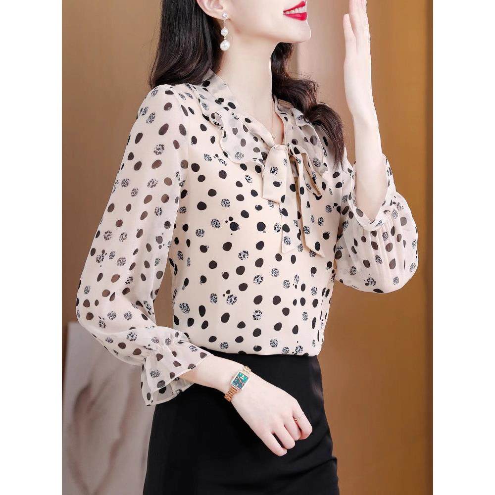 雪纺衬衫女长袖春秋薄款2025新款宽松遮肚子减龄洋气波点小衫上衣