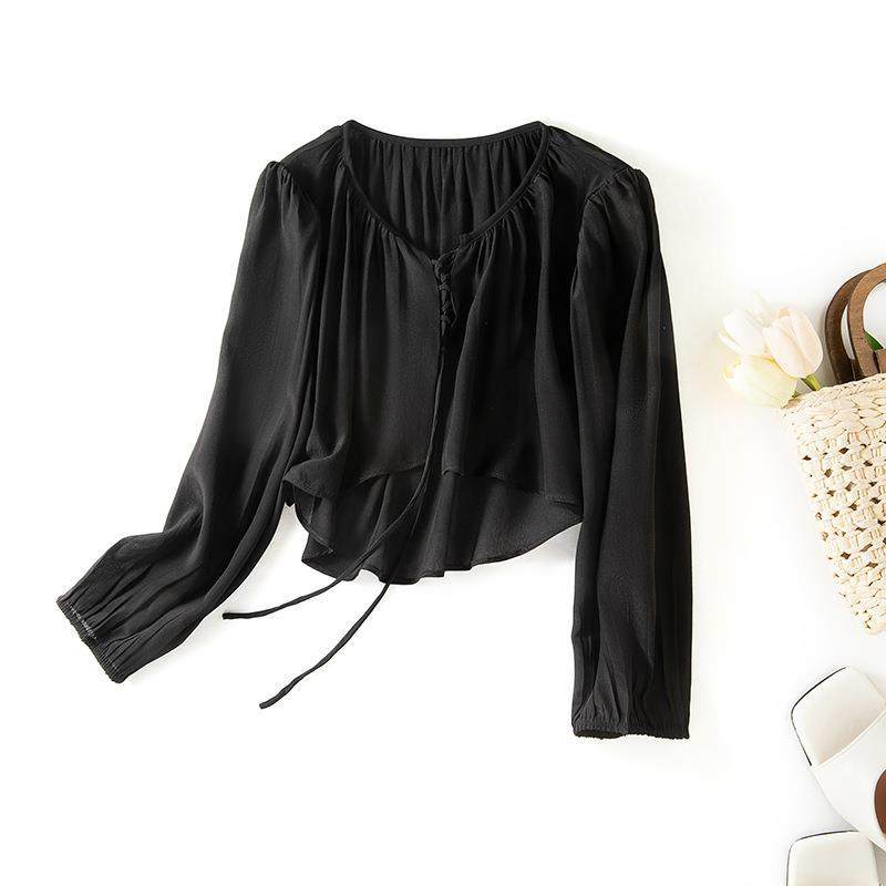 双绉!!!桑蚕丝长袖女装短款系带沙滩防晒衣飘逸真丝85101