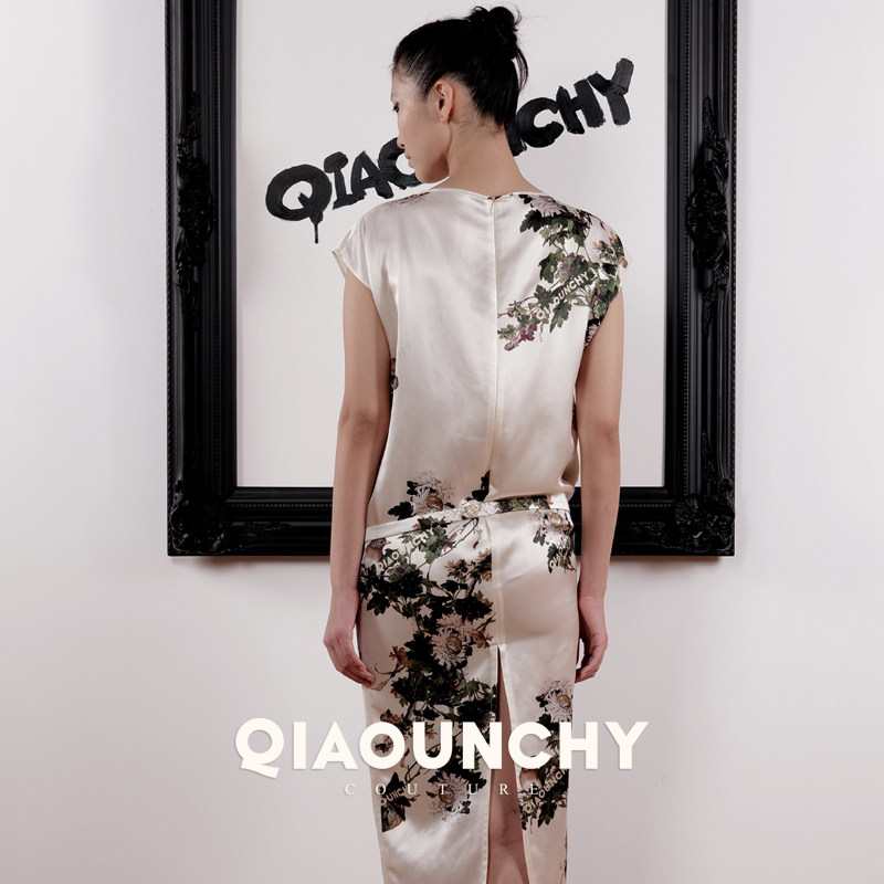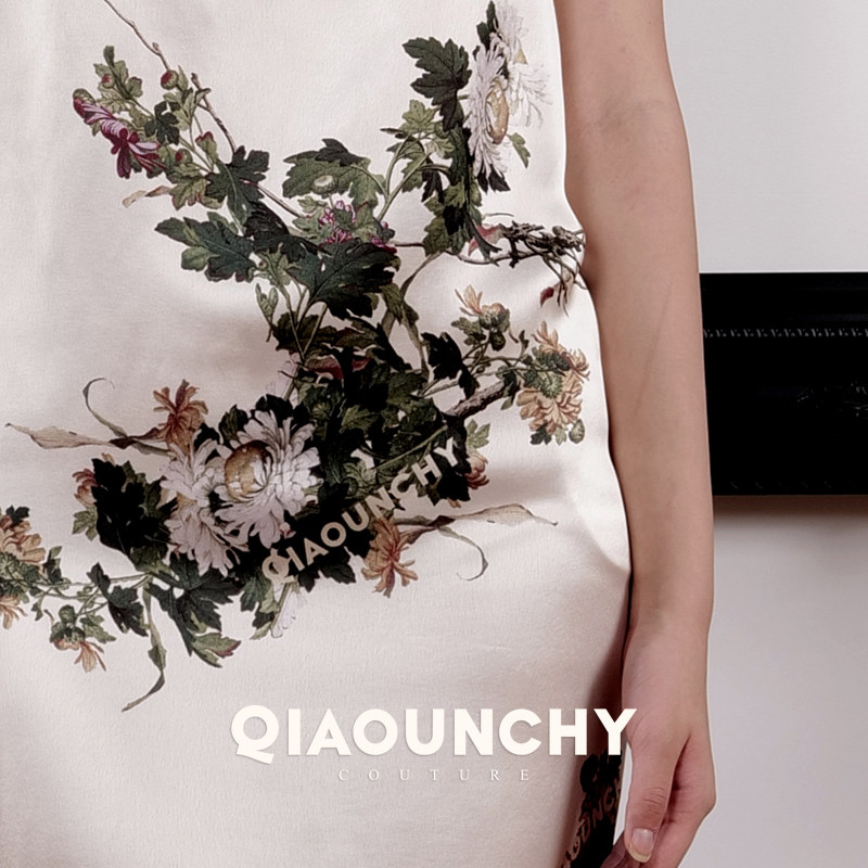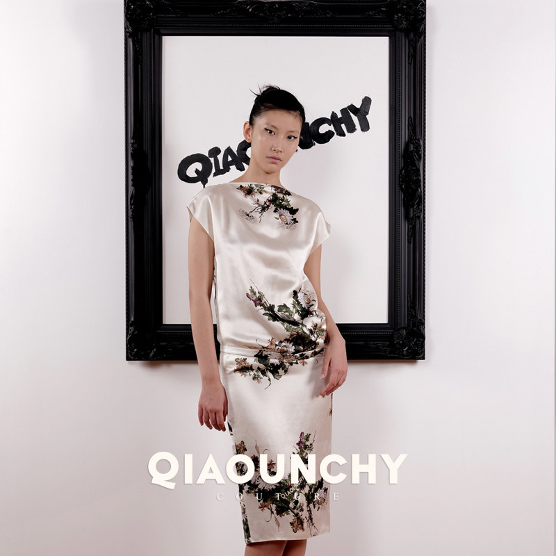 郎世宁的花鸟图 QIAOUNCHY俏云曦|法式优雅缎面一字领连肩连衣裙