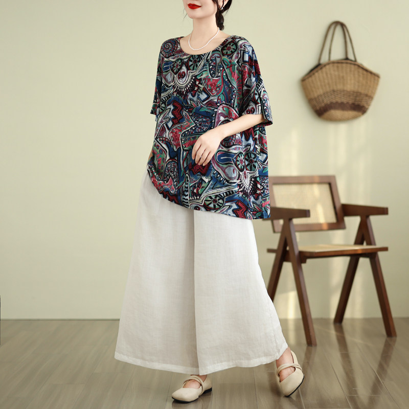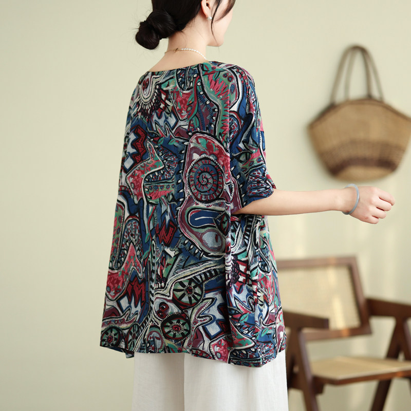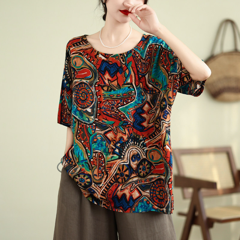 复古民族风中老年女装印花短袖大码胖MM260斤夏装圆领绵绸上衣女