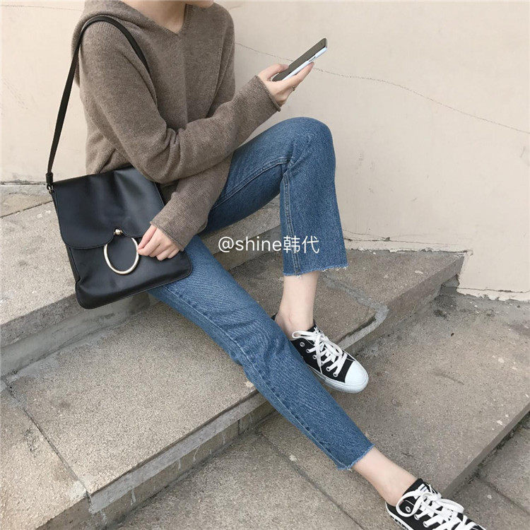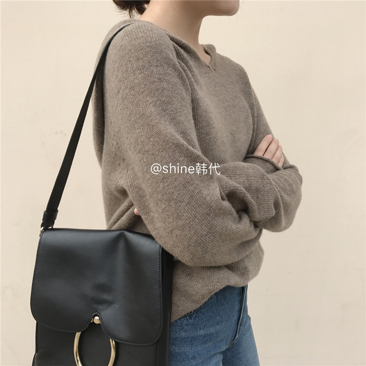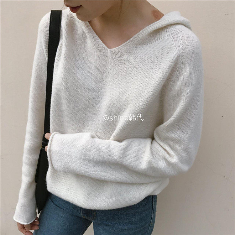 春装v领羊毛针织衫慵懒打底宽松连帽衫女外套针织毛衣卫衣