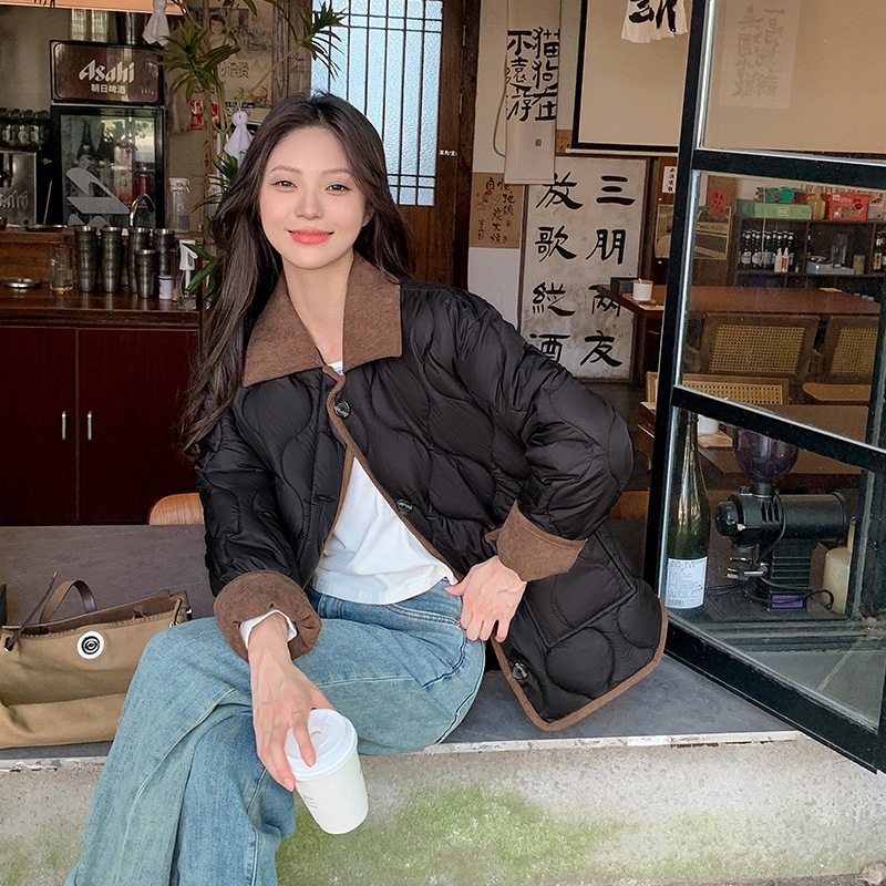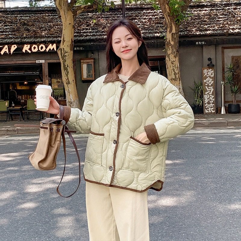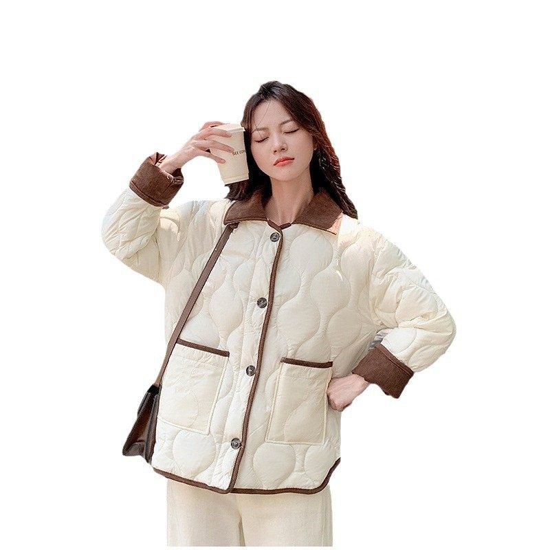 2024秋季新款小香风短款薄款棉服女撞色翻领菱格轻薄宽松棉袄外套