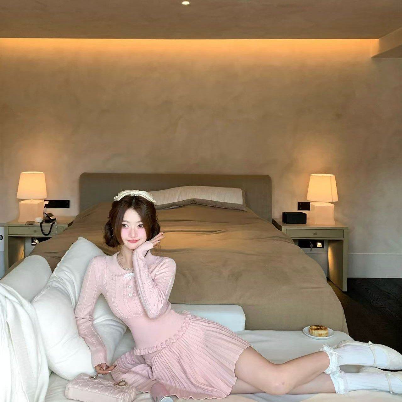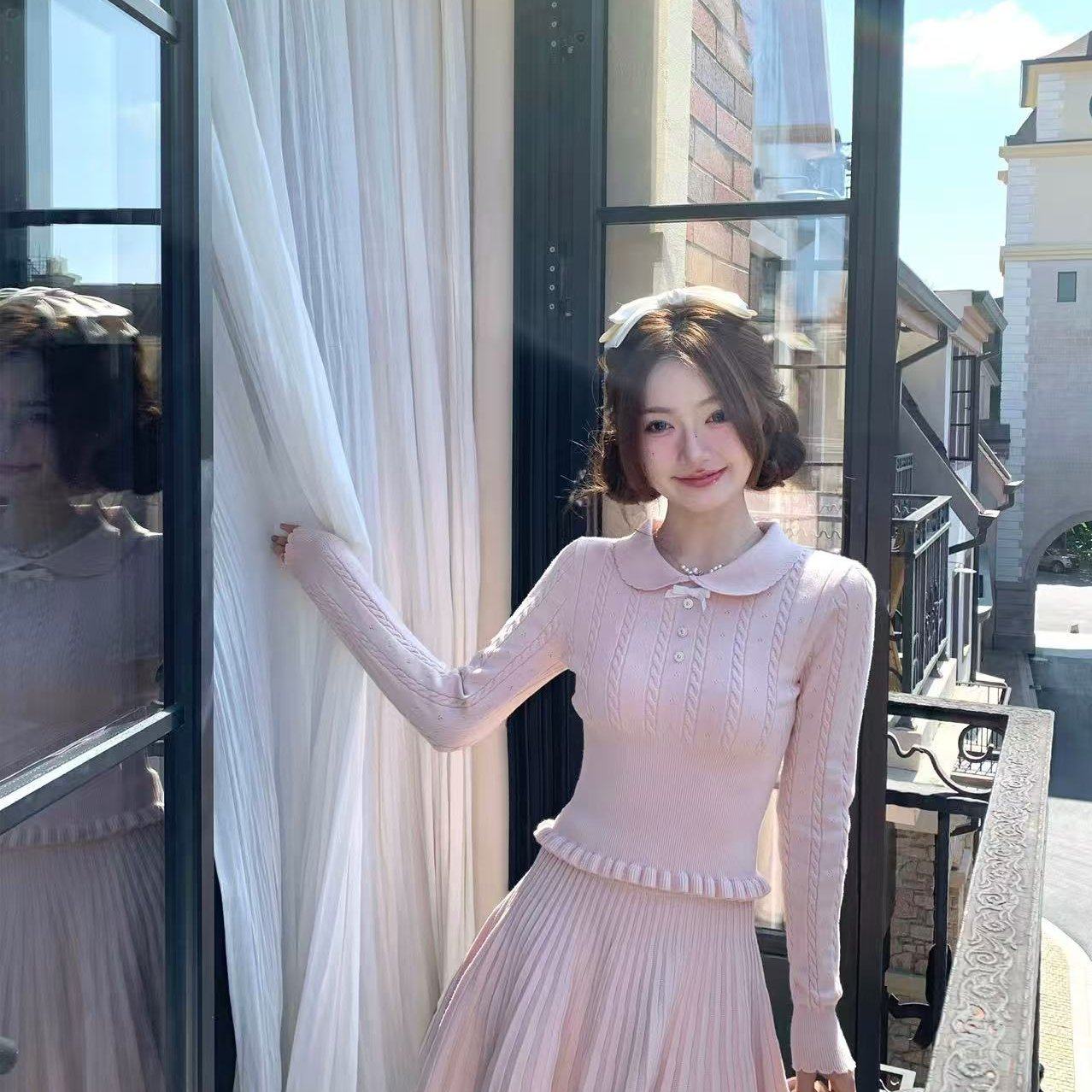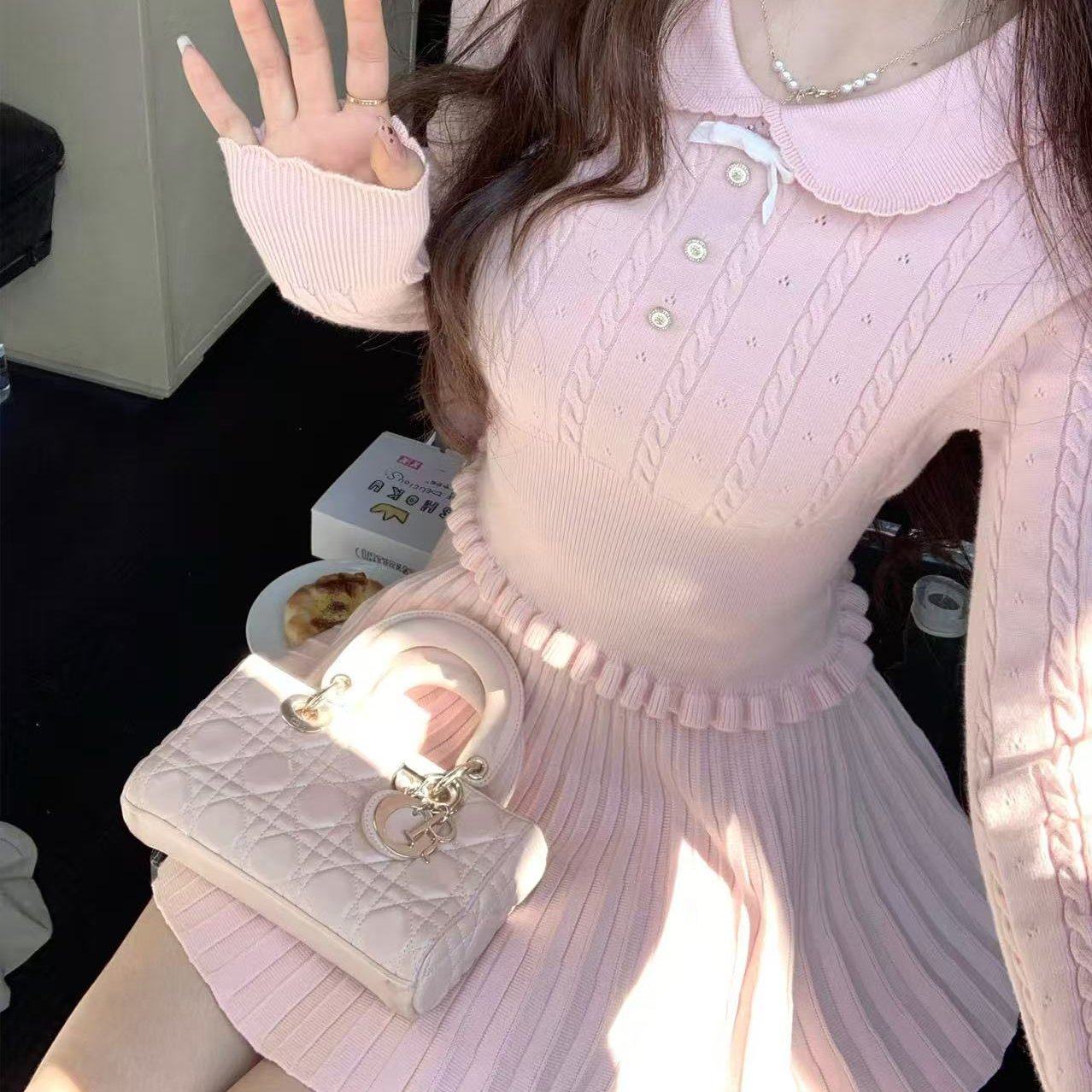 Q女家 进修校花/千金感粉色长袖上衣针织毛衣超好看秋冬裙子套装