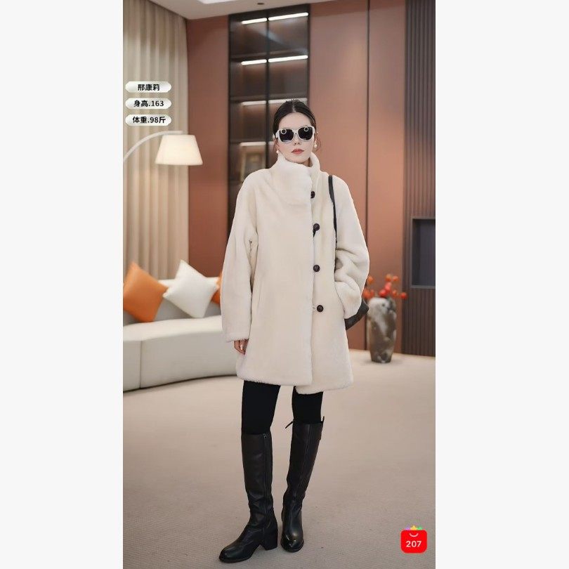 《邢康莉甄选》中长款立领纽扣款多色皮毛一体外套 40850