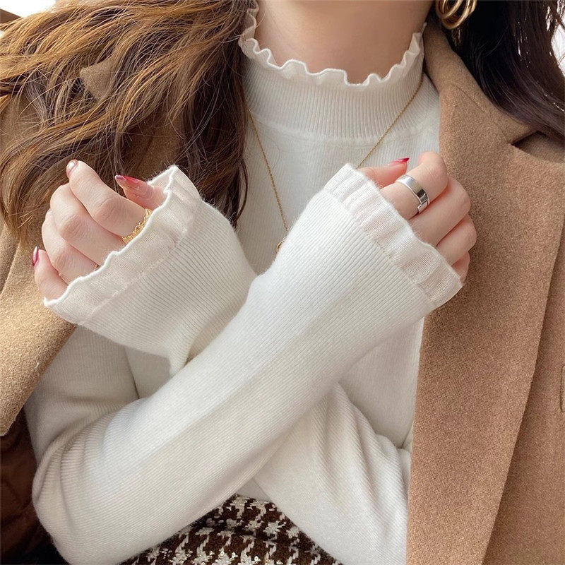 木耳边半高领长袖针织衫女秋冬内搭套头小众打底毛衣设计感上衣潮