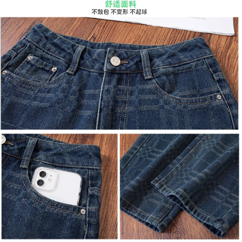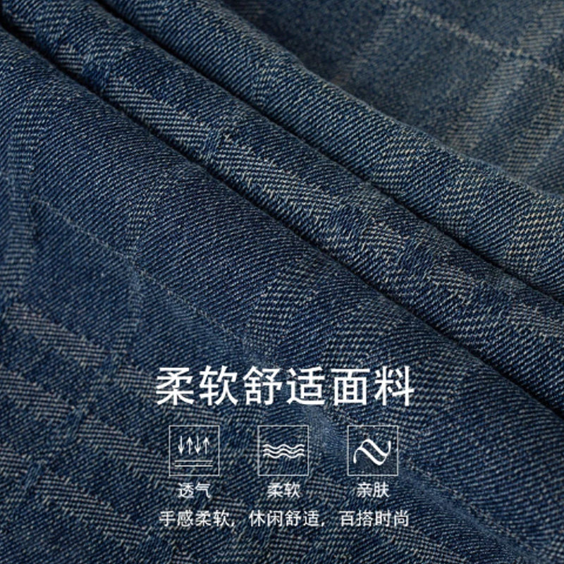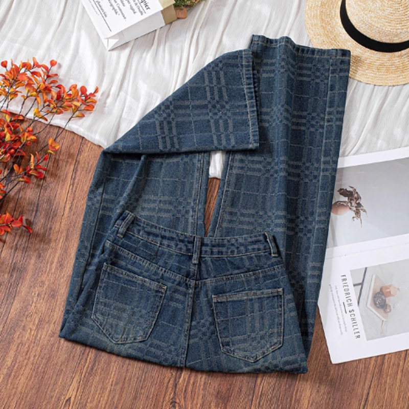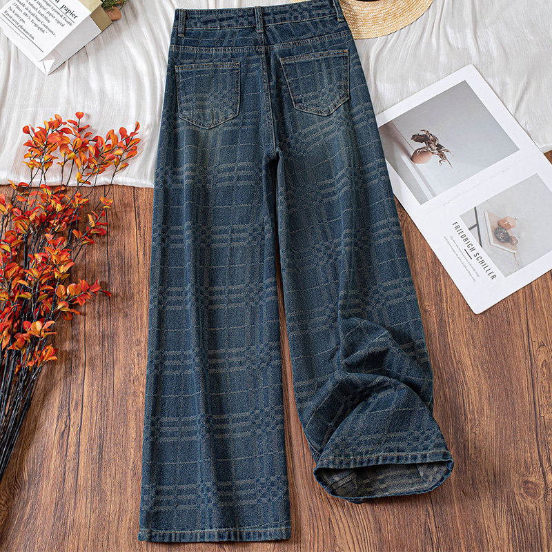 啄木鸟牛仔裤女2026春季新款复古蓝格纹阔腿牛仔窄版直筒长裤