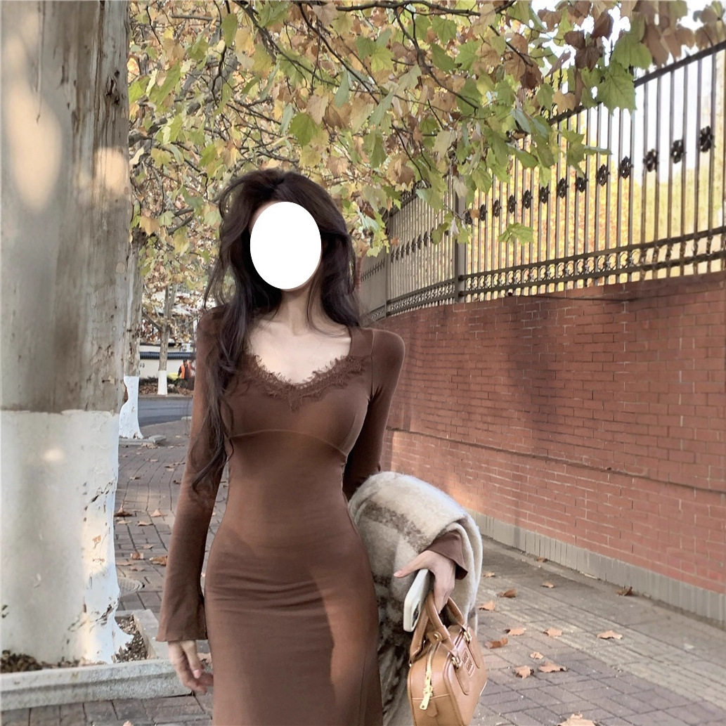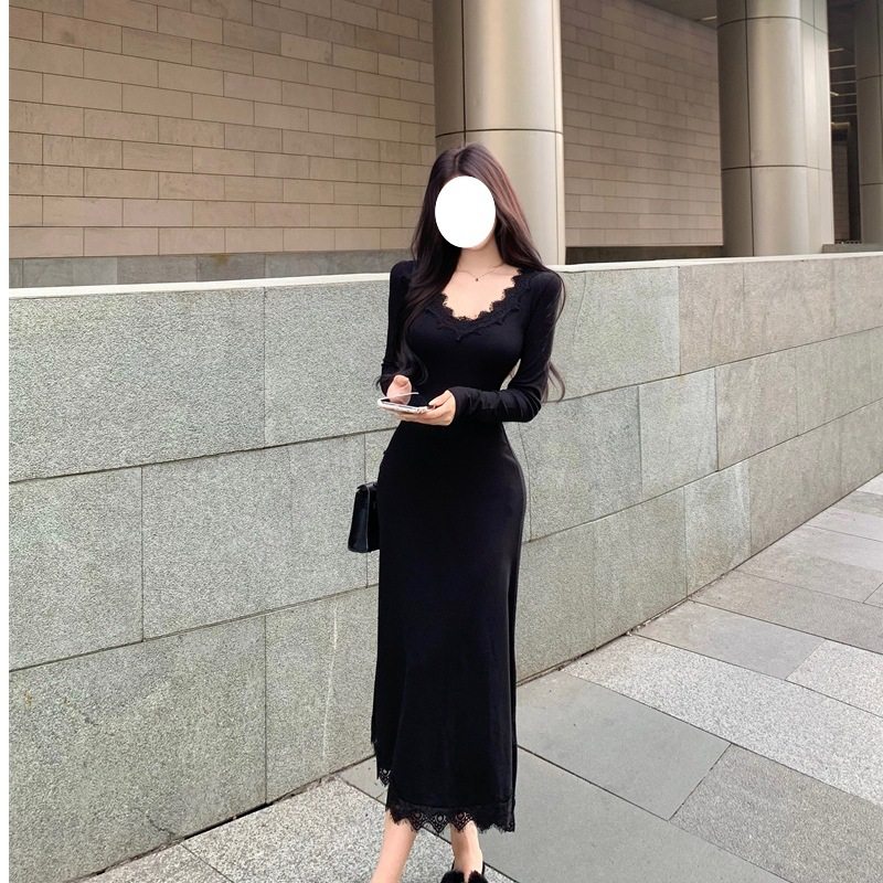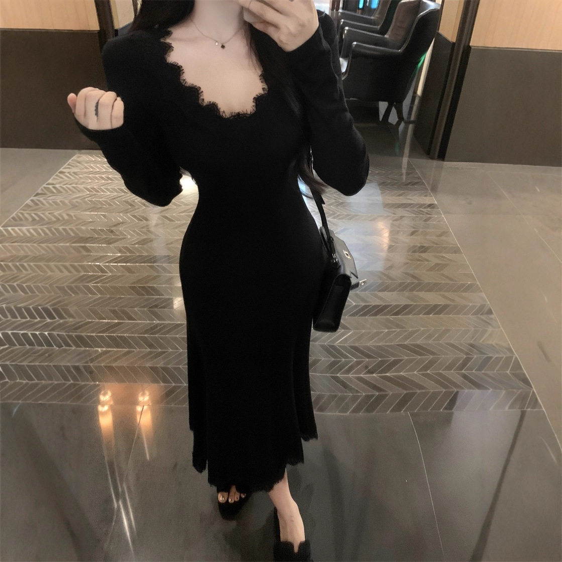 春季新款长袖拼接鱼尾连衣裙女打底黑色蕾丝收腰修身气质裙子长裙