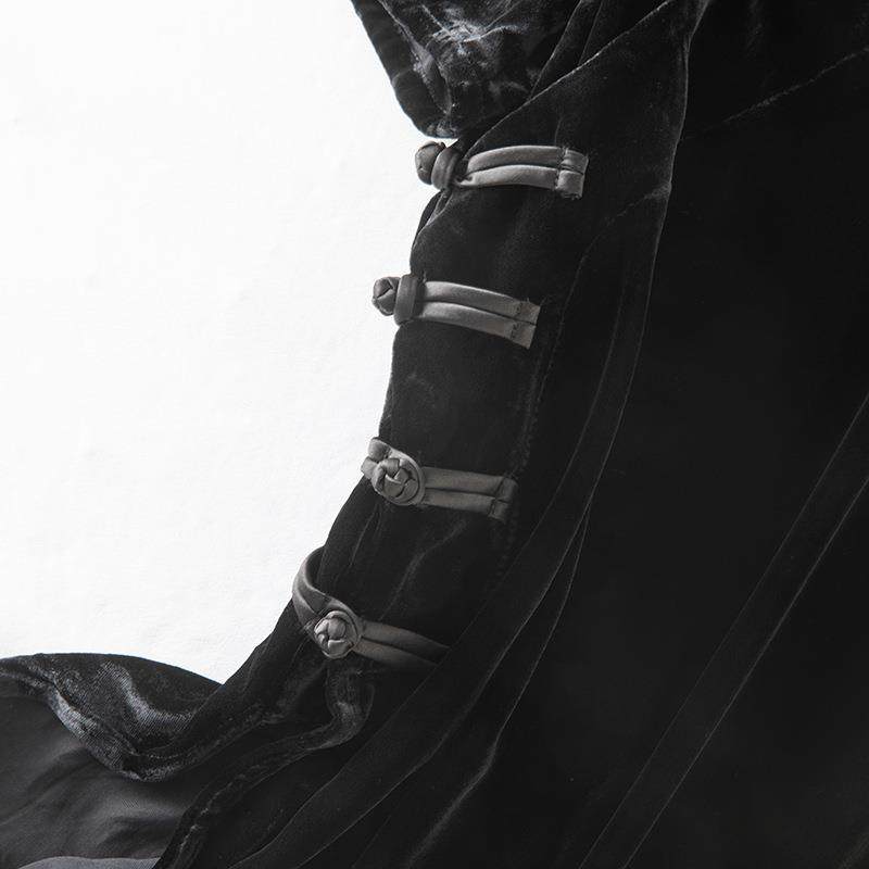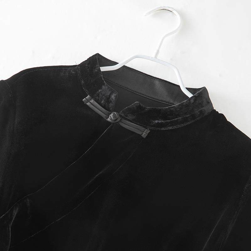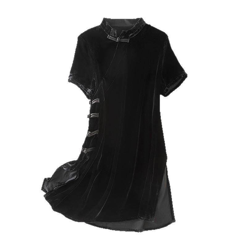 女装新中式国风真丝丝绒连衣裙复古小立领斜襟短袖打底裙 85117