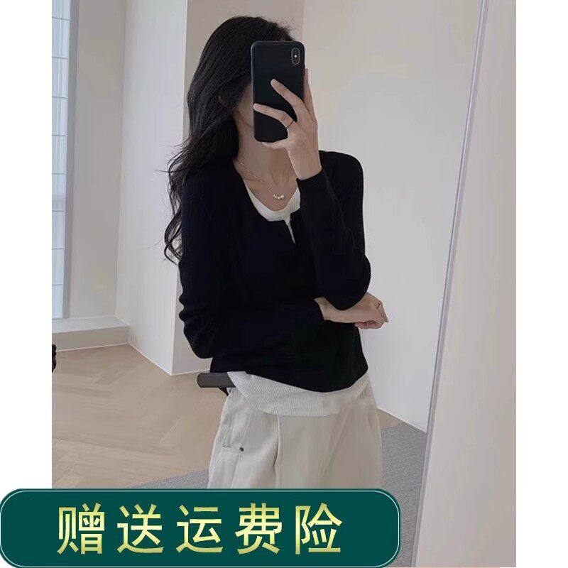 黑色假两件V领内搭打底衫女春秋修身短款毛衣针织衫长袖上衣早春
