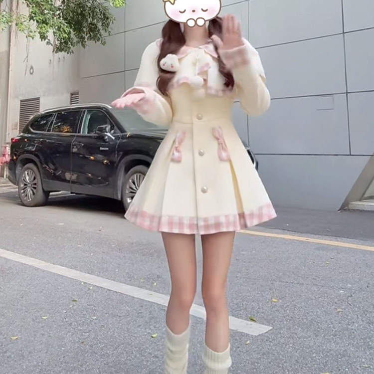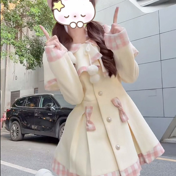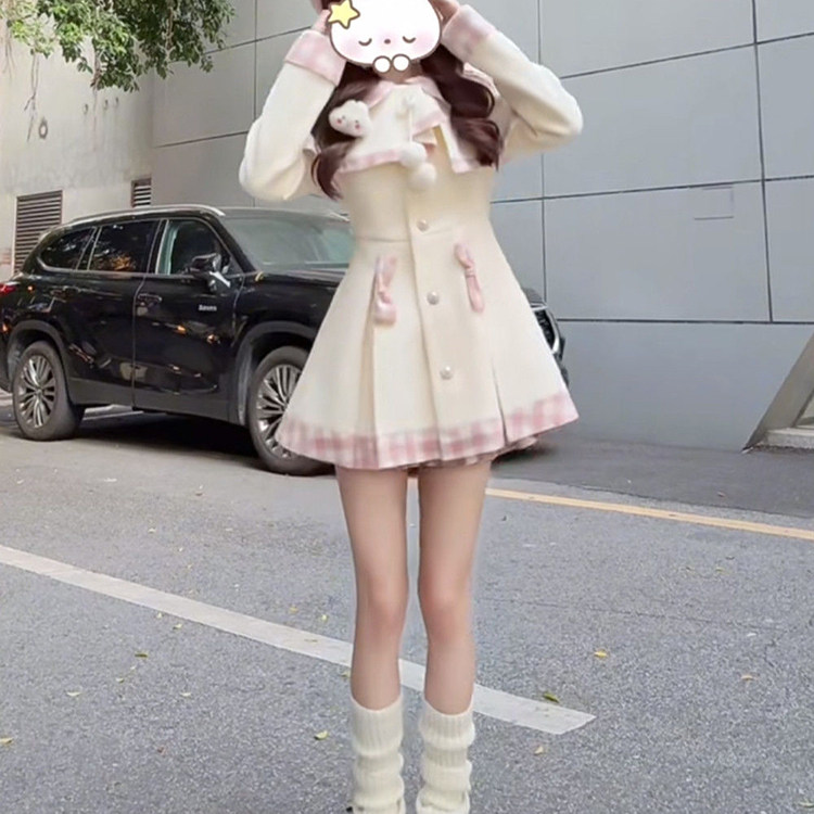 首页> 女装> 日系甜美可爱套装裙女秋冬新款小个子收腰显瘦毛呢外套斗篷两件套