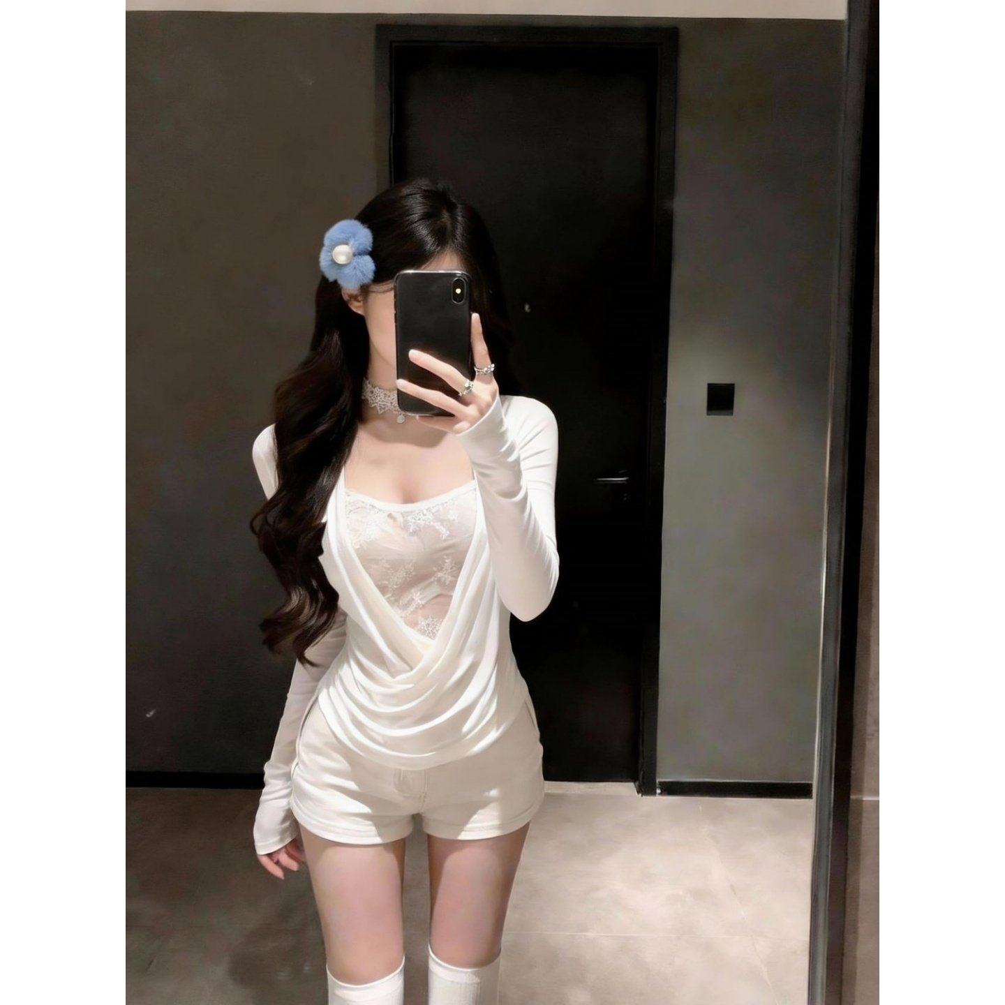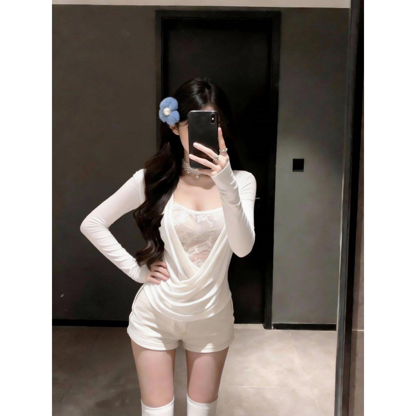 巨好看2026穿搭一整套纯欲白色蕾丝修身长袖上衣显瘦短裤两件套