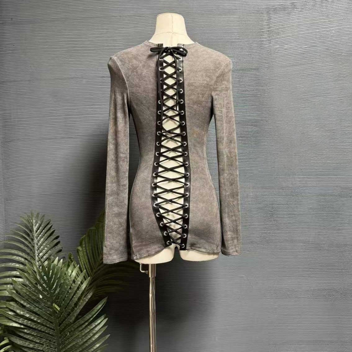 镜服饰2026春季性感辣妹长袖T恤女背后绑带心机设计感上衣10801