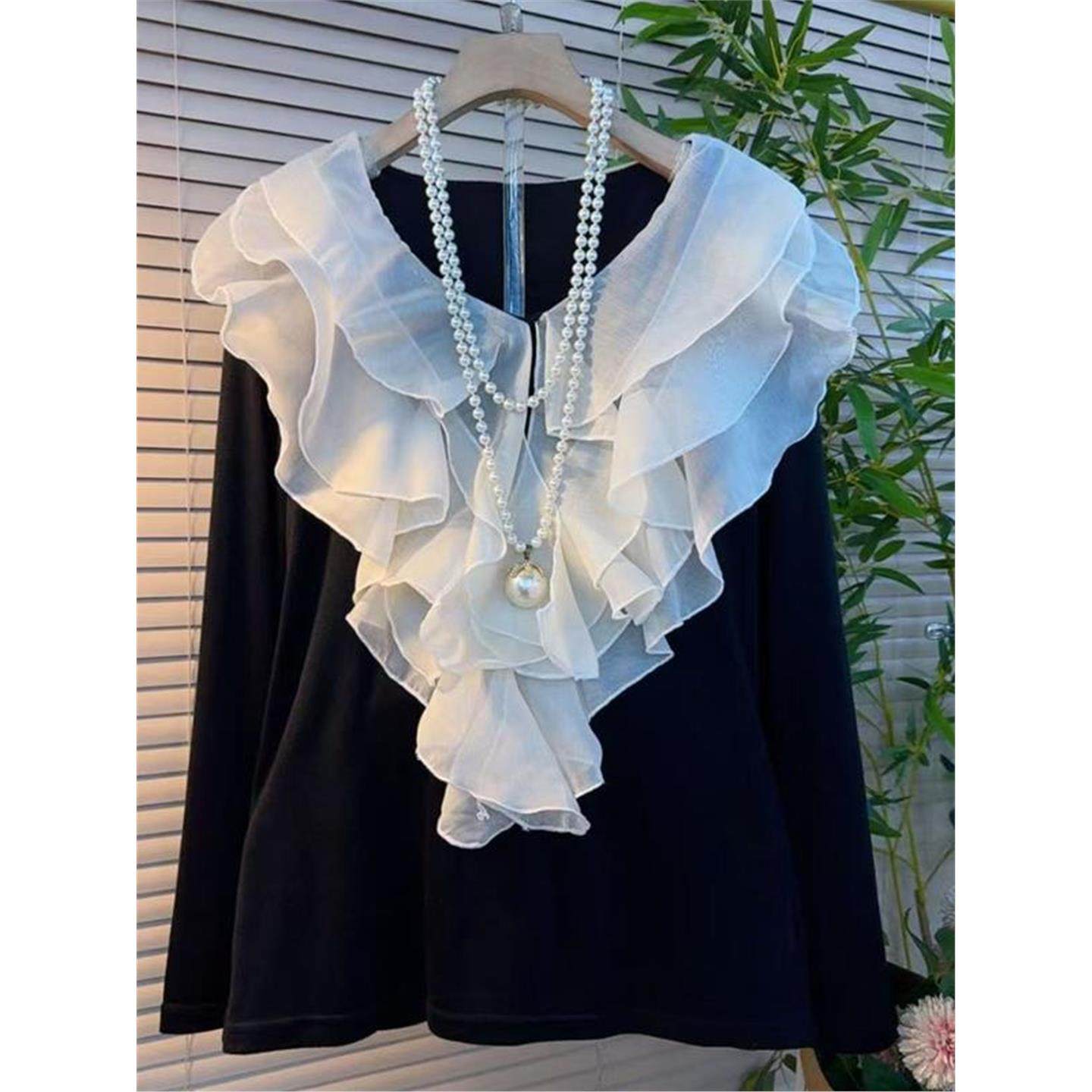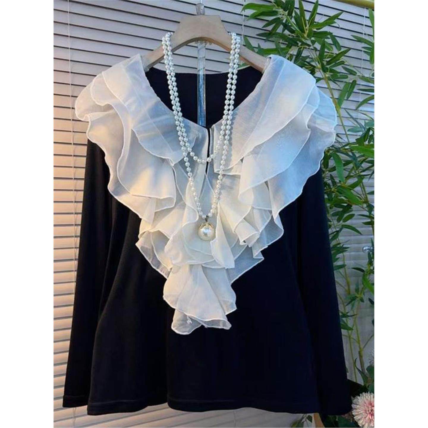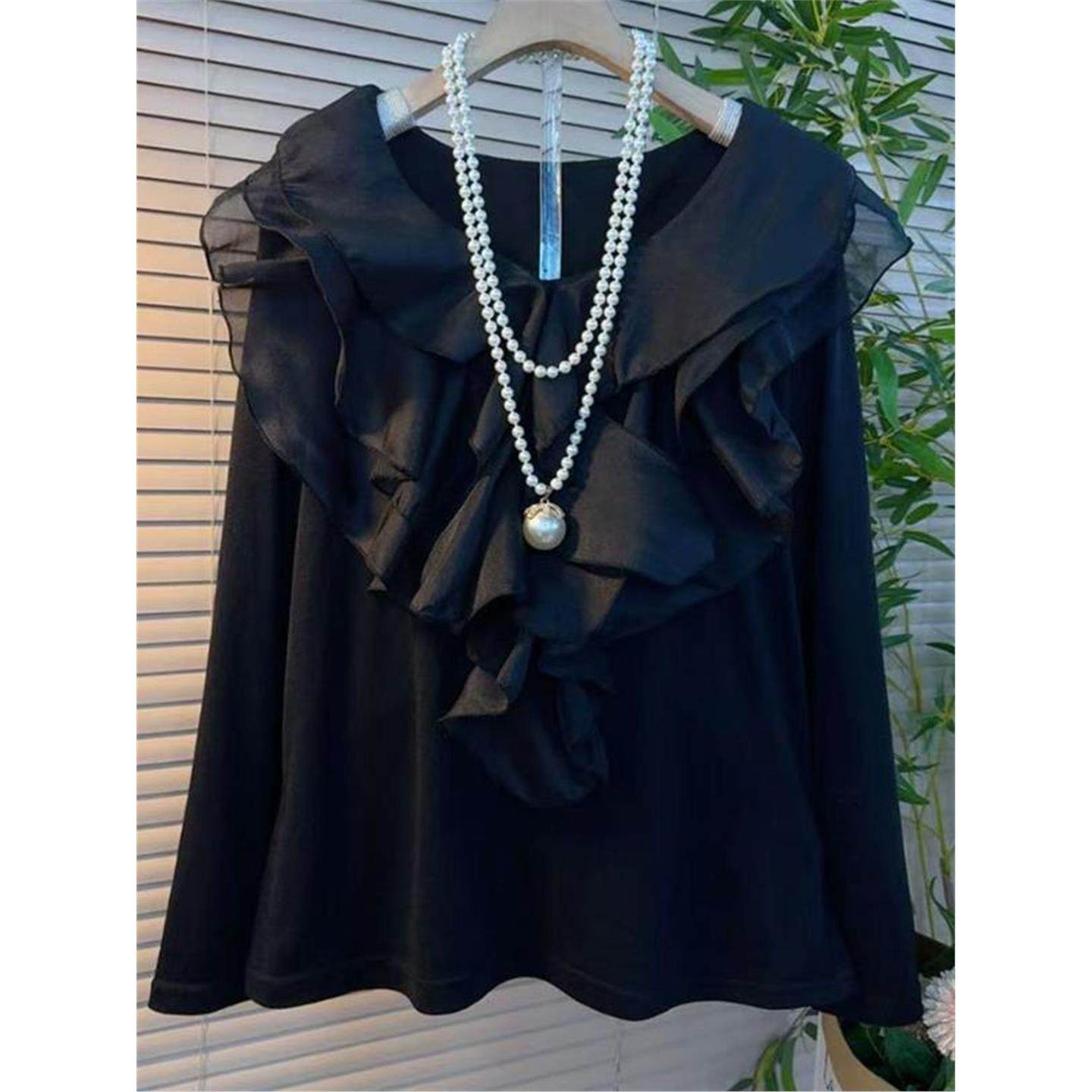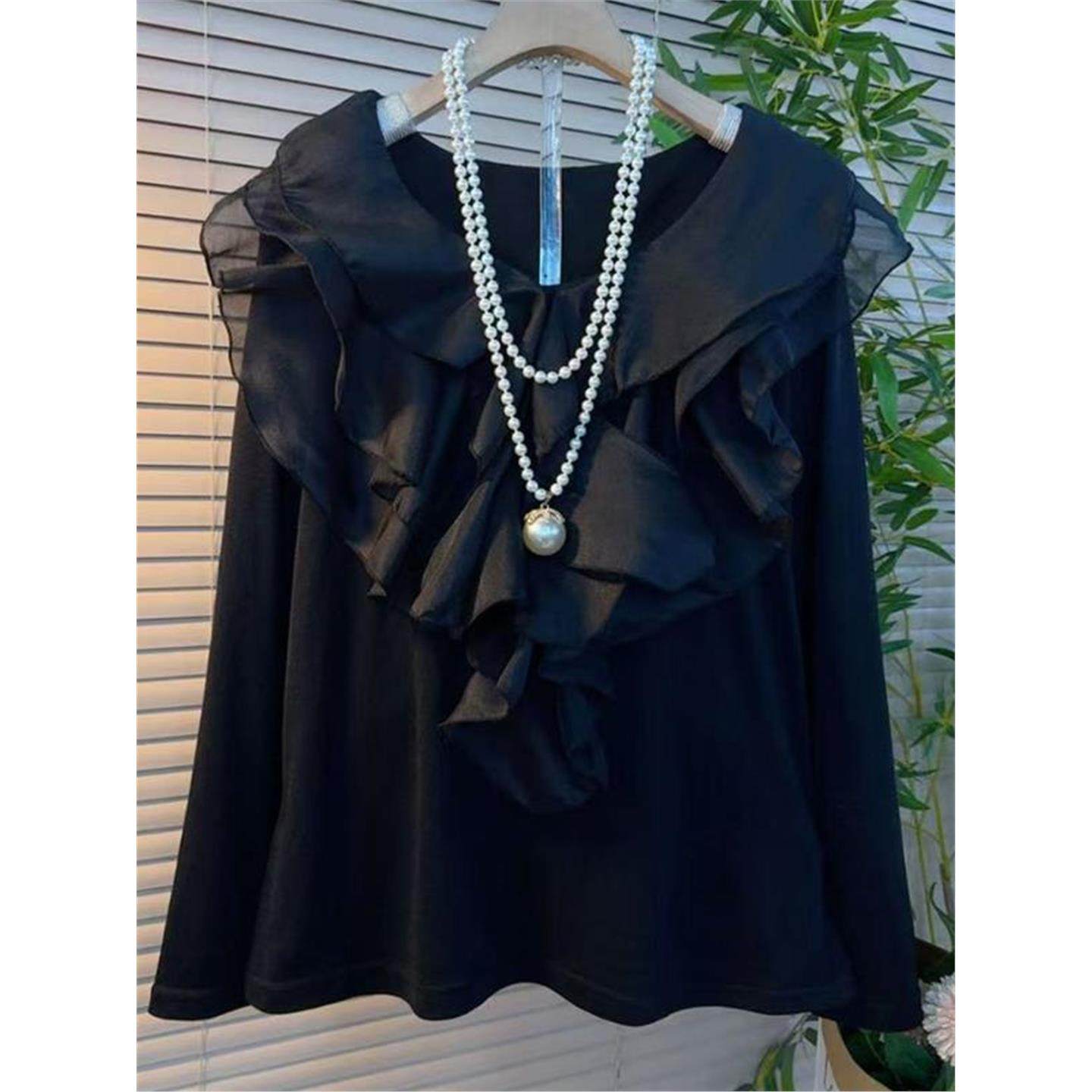 大码女装秋冬新款时尚韩版洋气花边拼接长袖打底衫黑色荷叶边上衣