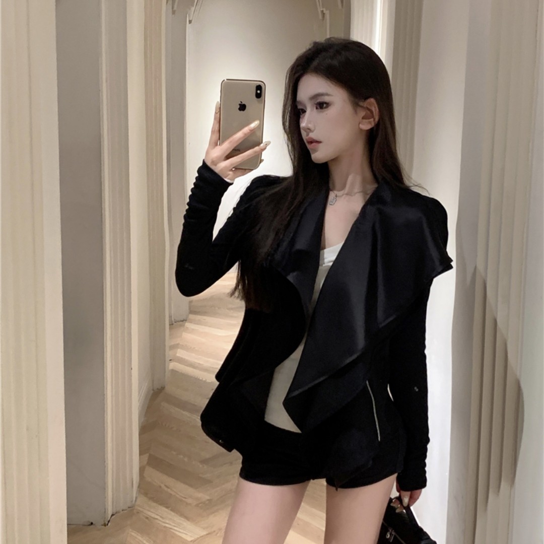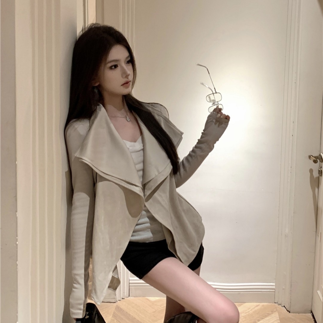 实价实拍螺纹针织布鹿皮拼接垂感有型短外套女新款慵懒上衣