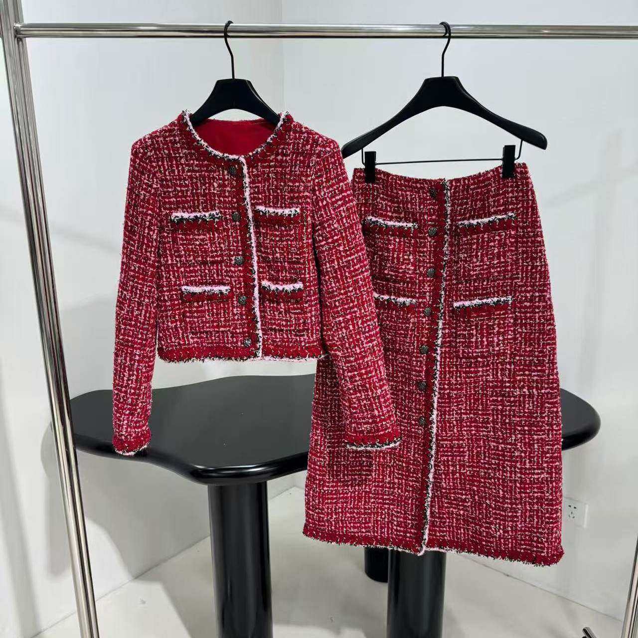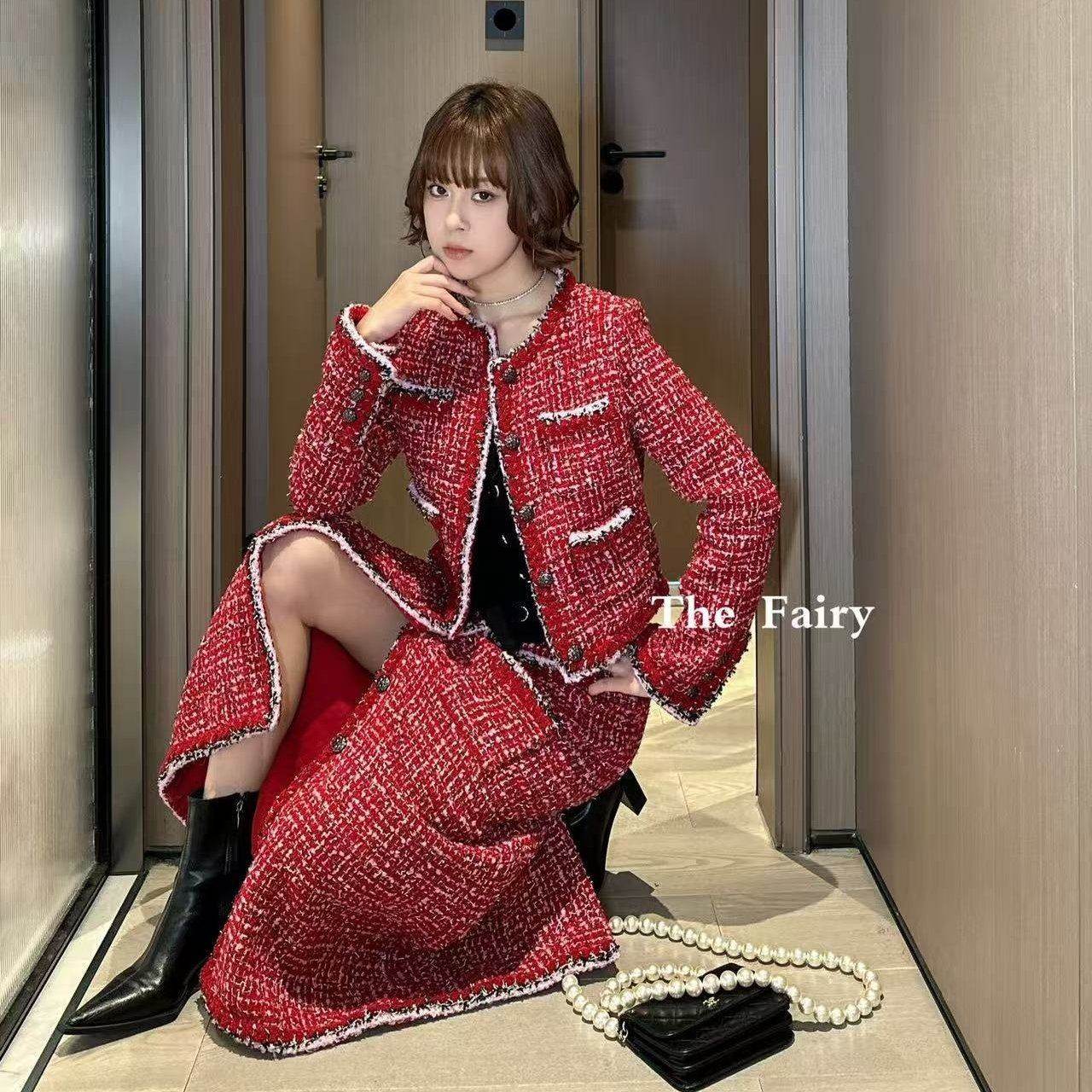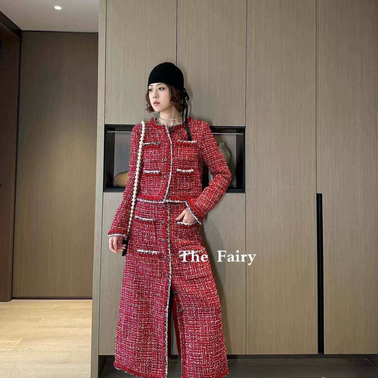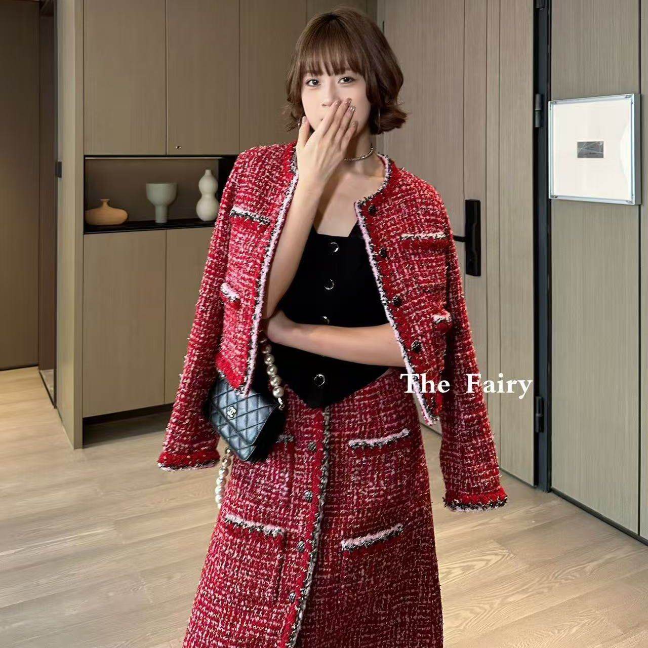 好漂亮好漂亮红色小香风外套搭配半裙时尚女装2025年冬季新款短潮