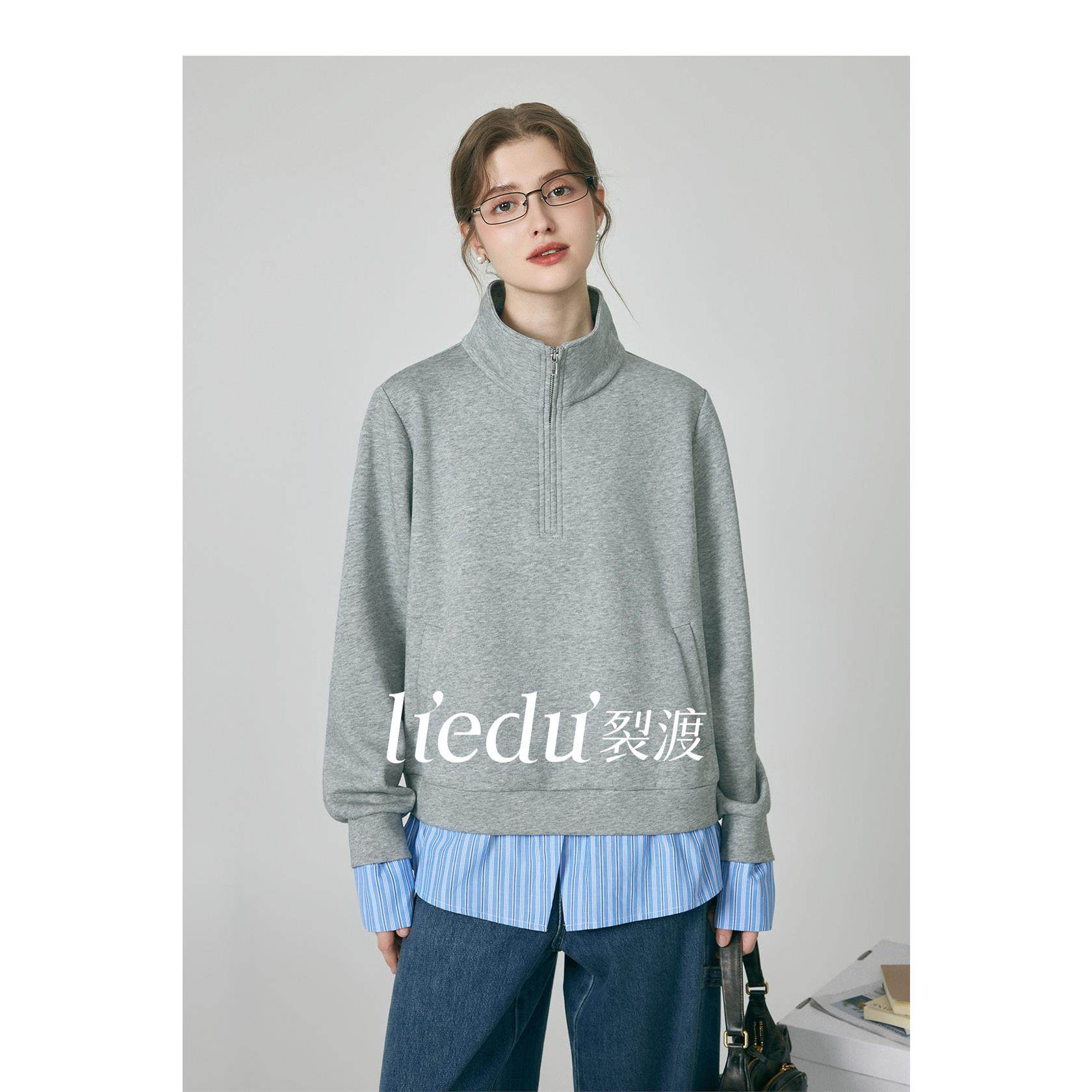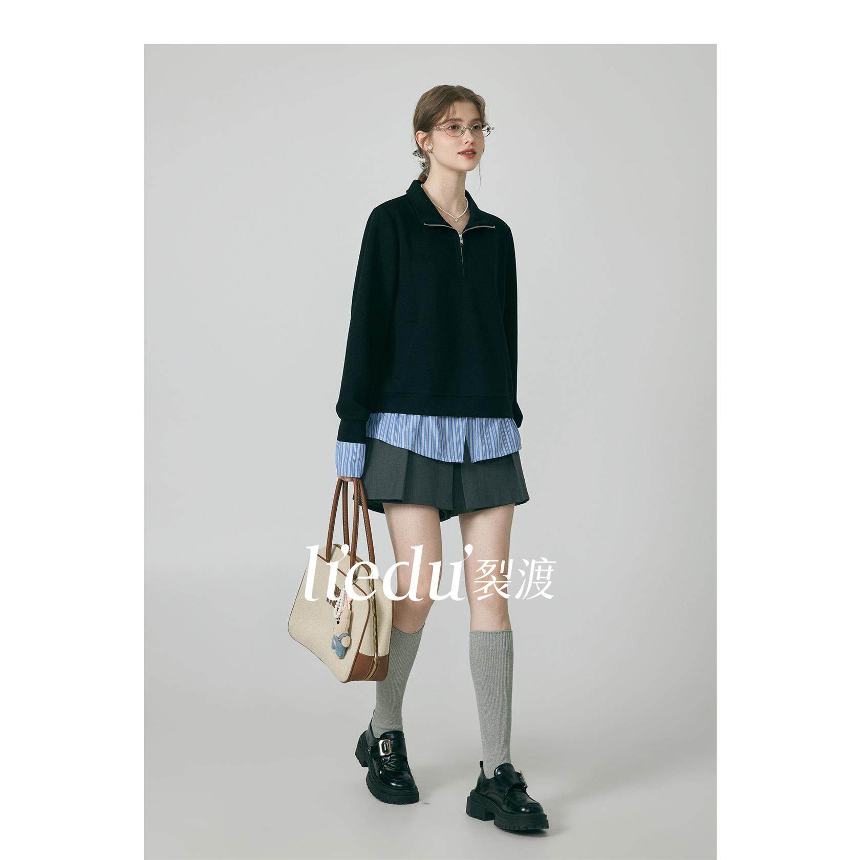 裂渡微胖大码女装【夜曲】韩系层次感假两件条纹衬衫拼接翻领卫衣