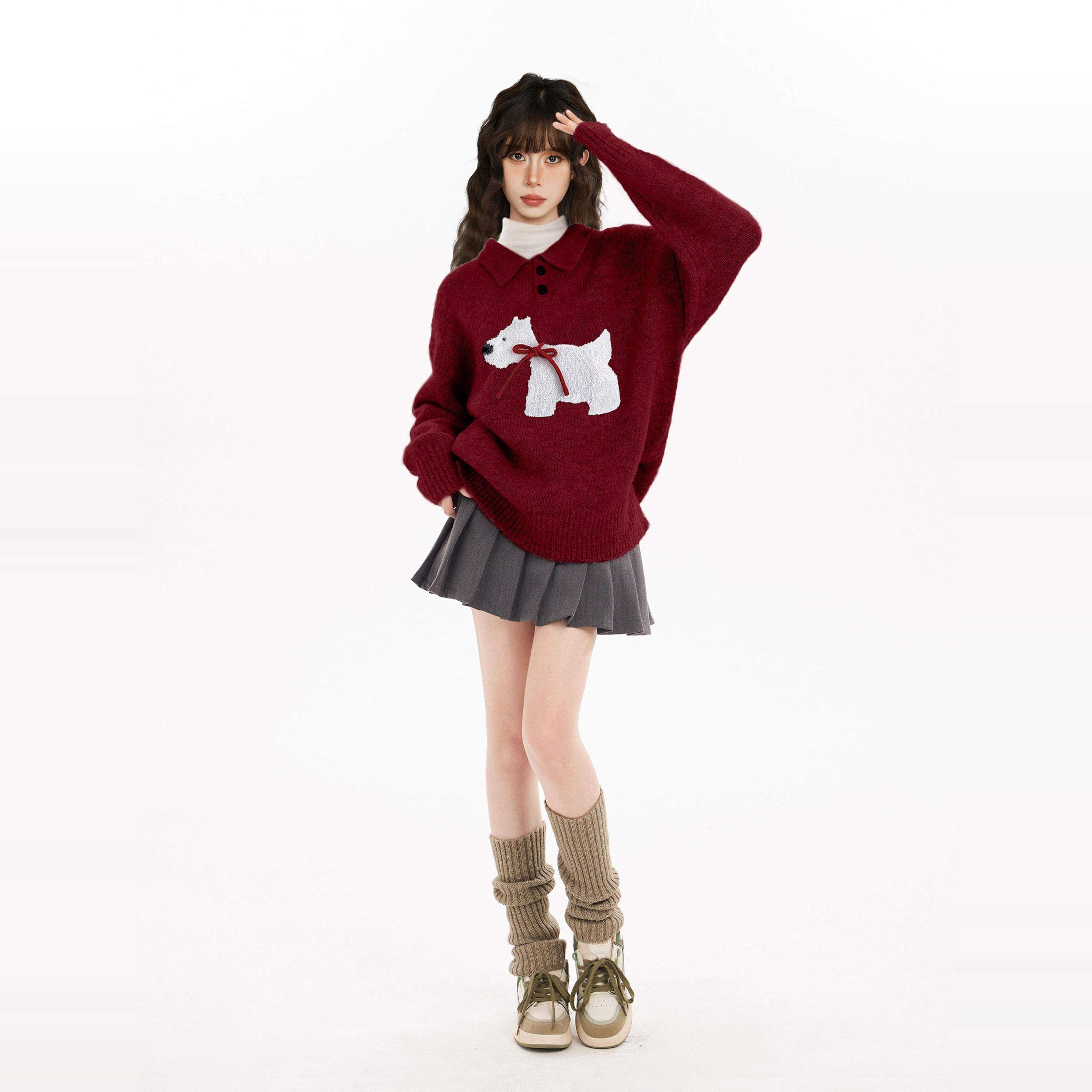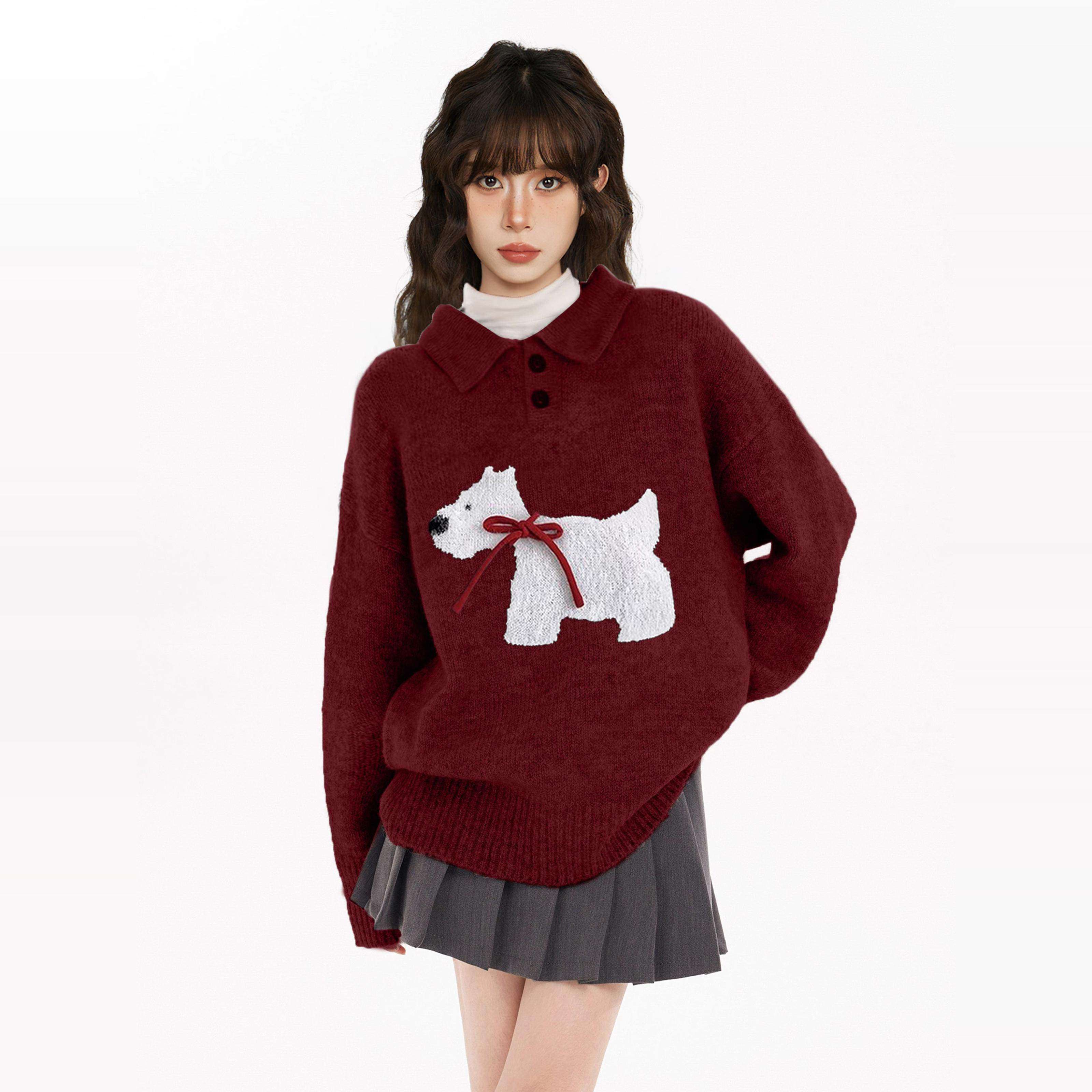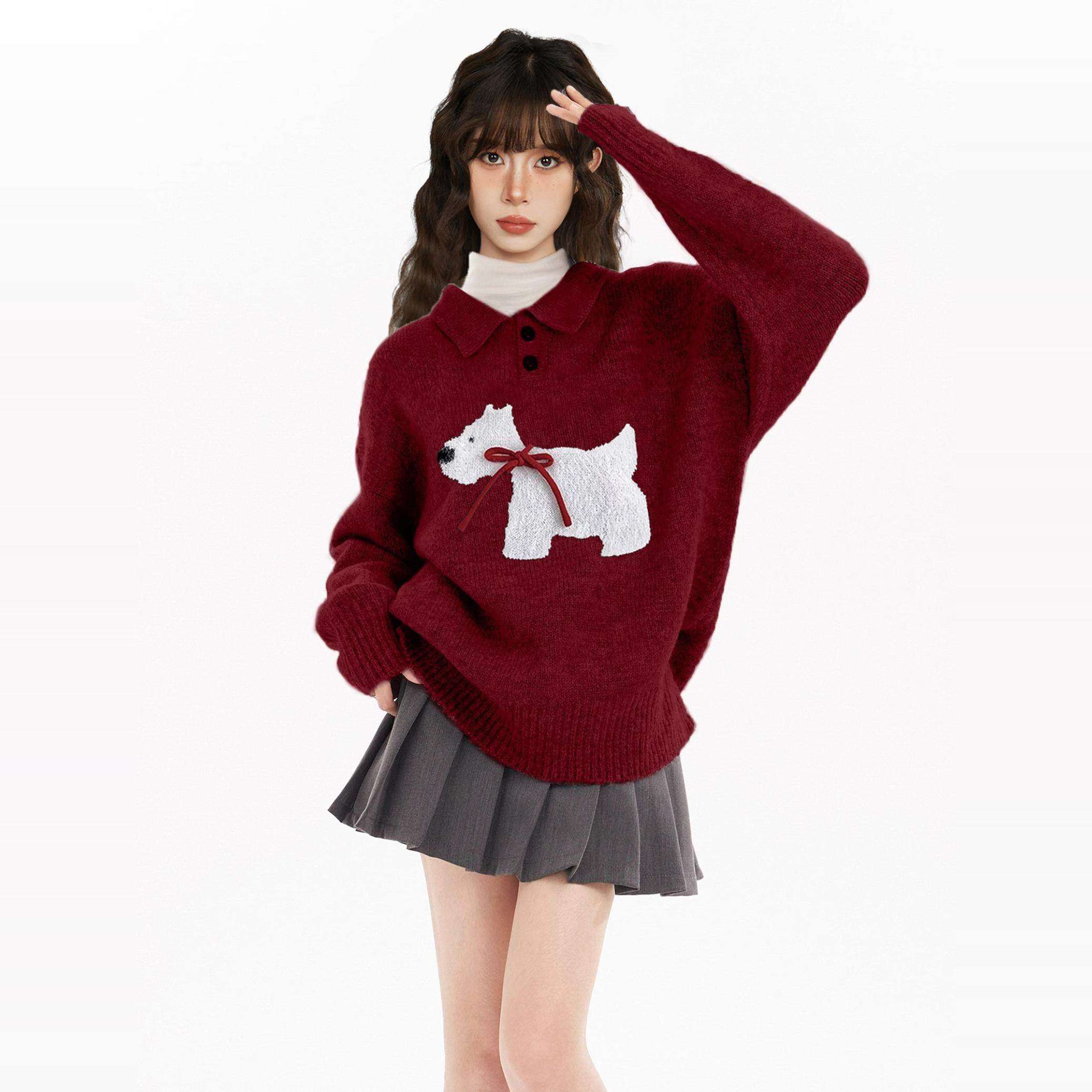 新年红色小狗polo翻领套头毛衣女秋冬冬季高级感针织衫本命年上衣