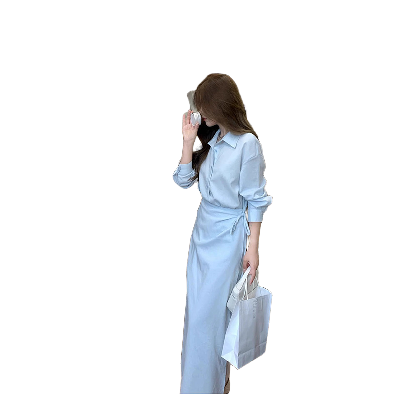 高级感假两件蓝色衬衫连衣裙女早秋季小众设计显瘦气质POLO长裙