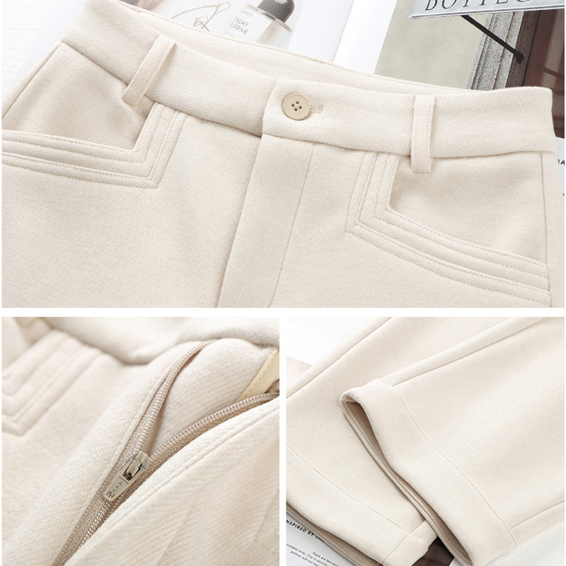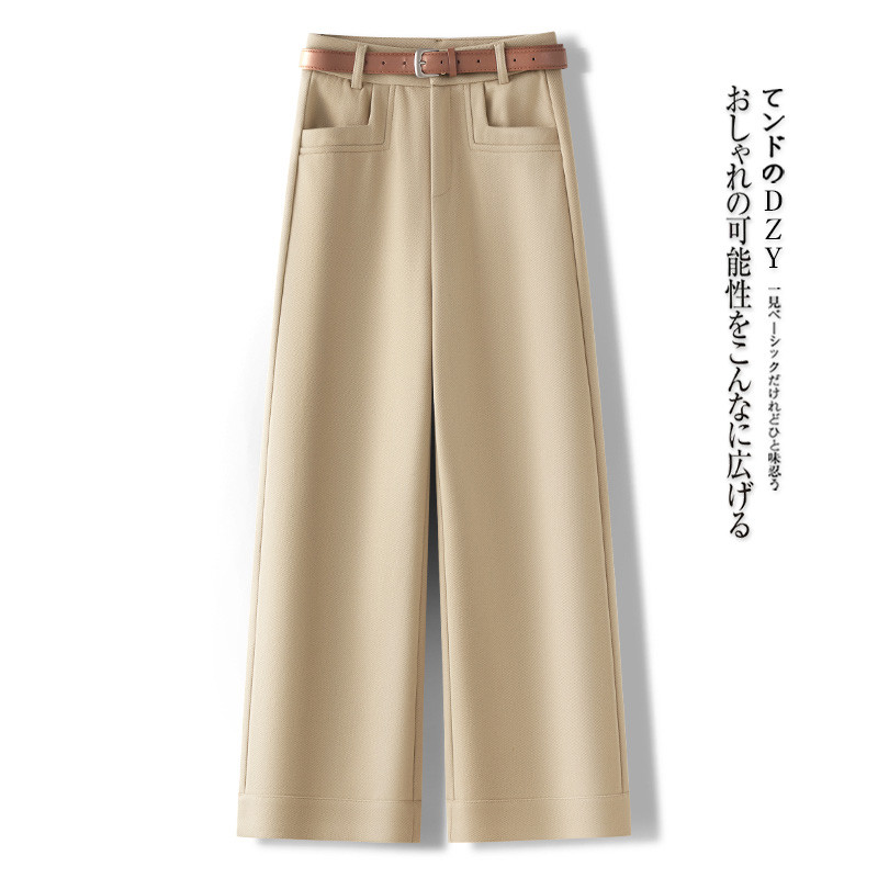 啄木鸟杏色毛呢阔腿裤女冬季呢子加绒加厚九分裤宽松显瘦直筒裤