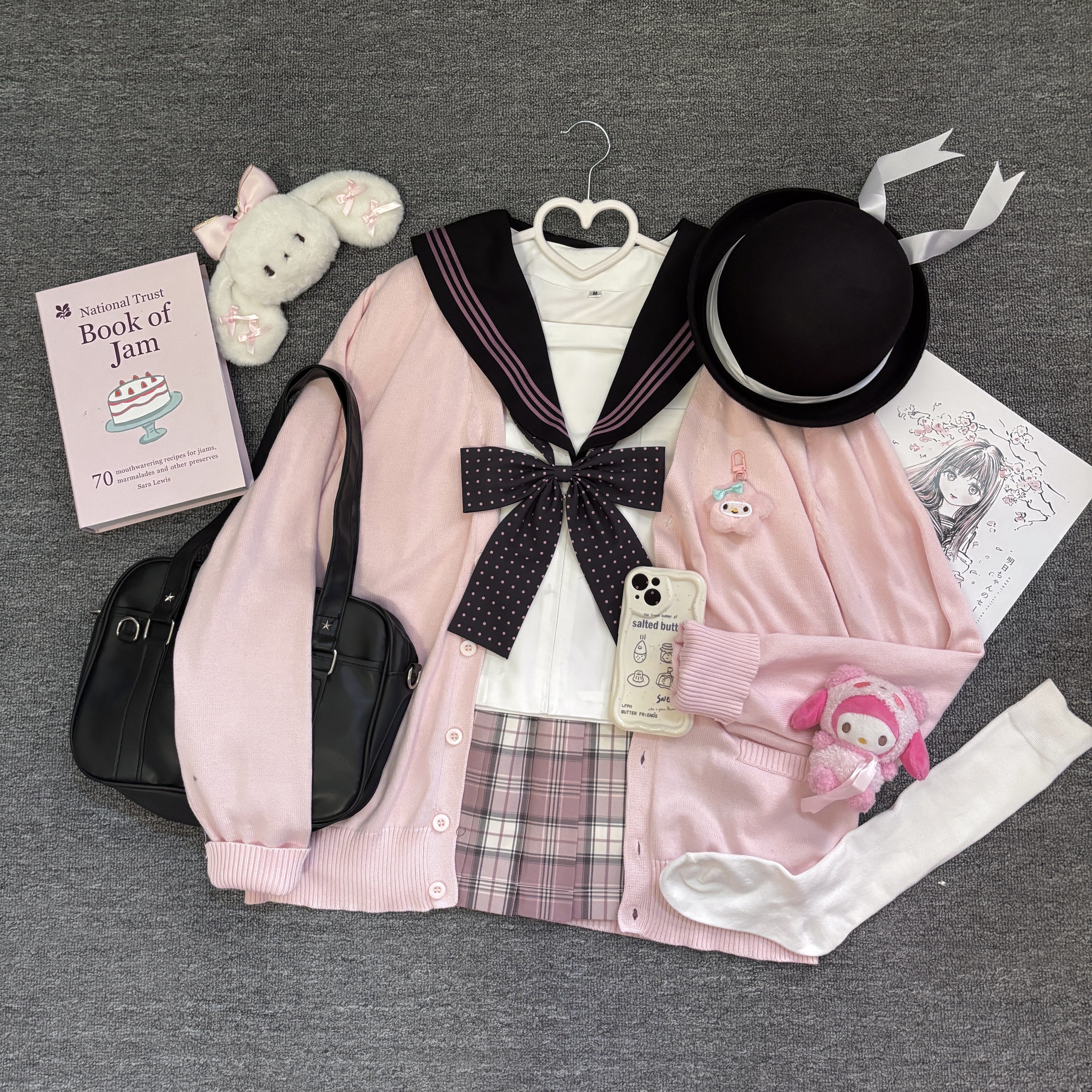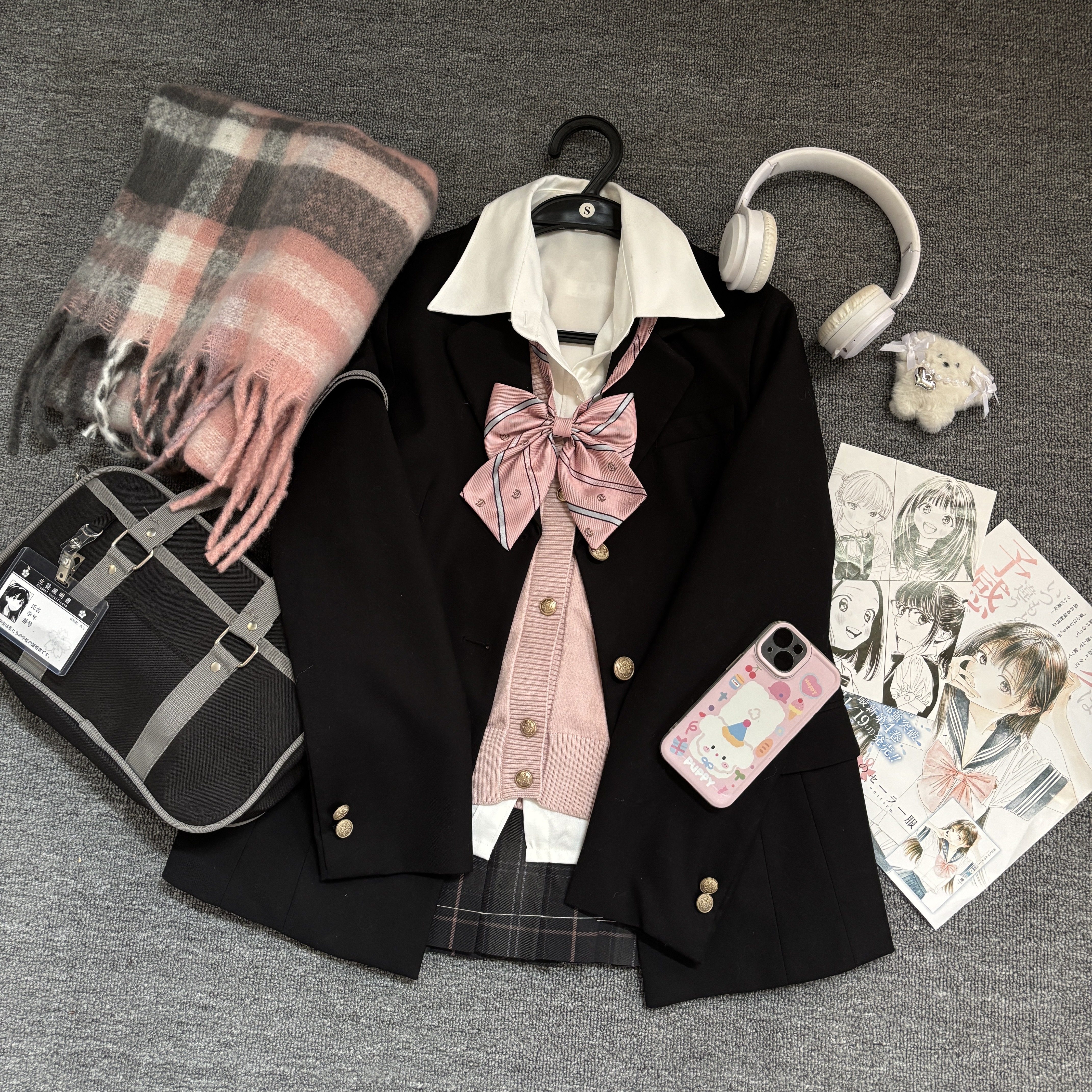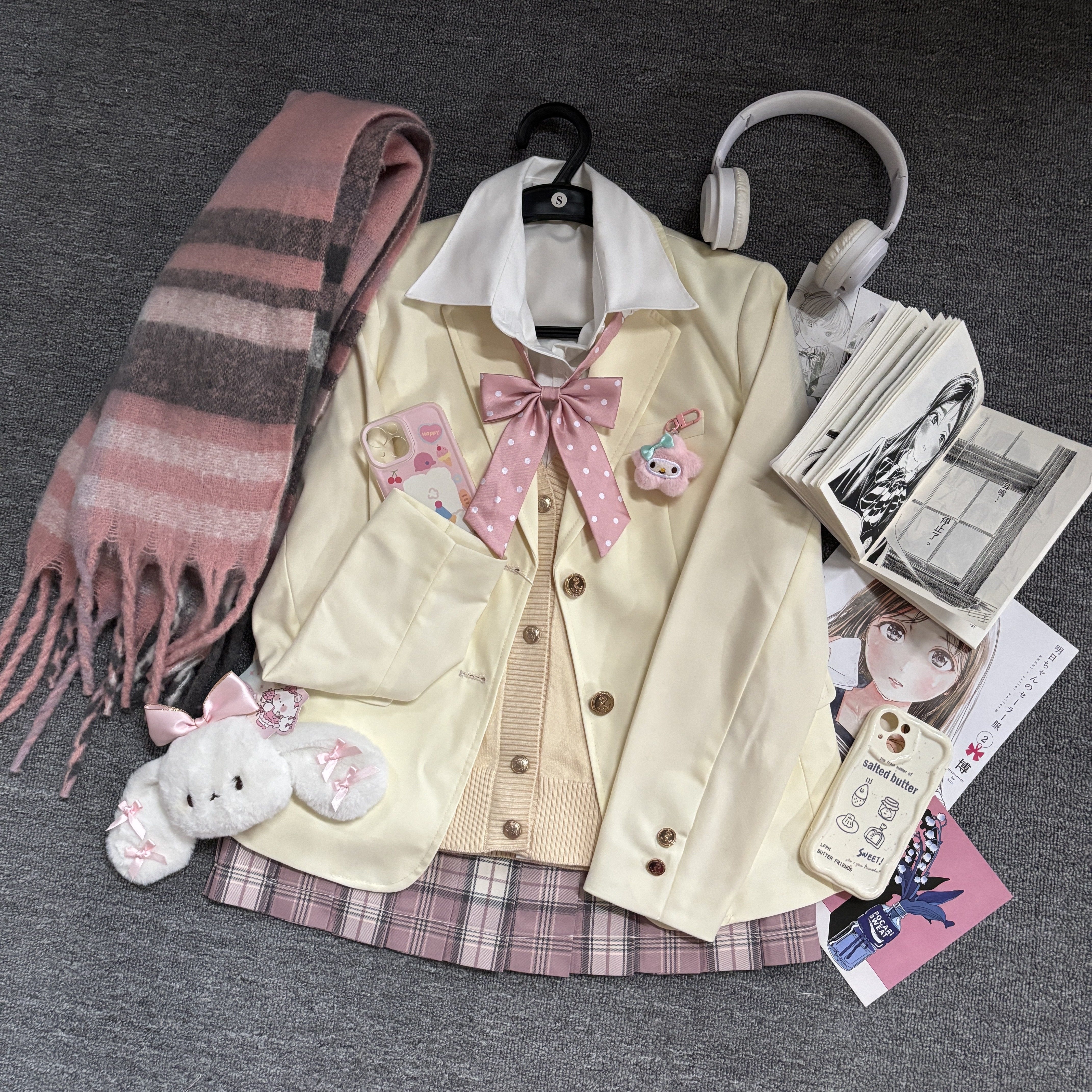 【粉色系JK套装】海月社原创JK粉色系列穿搭西服开衫毛衣格裙叠穿