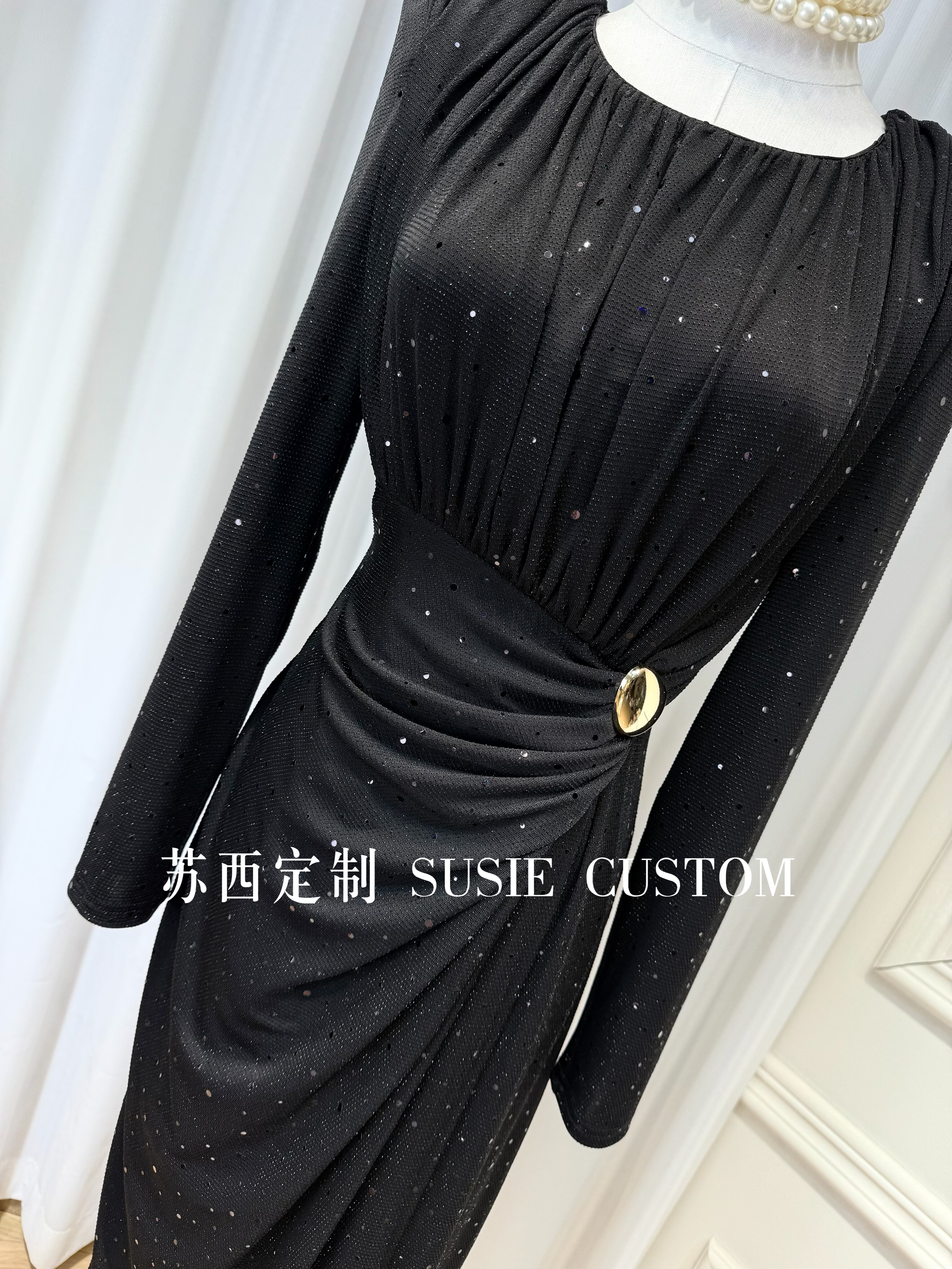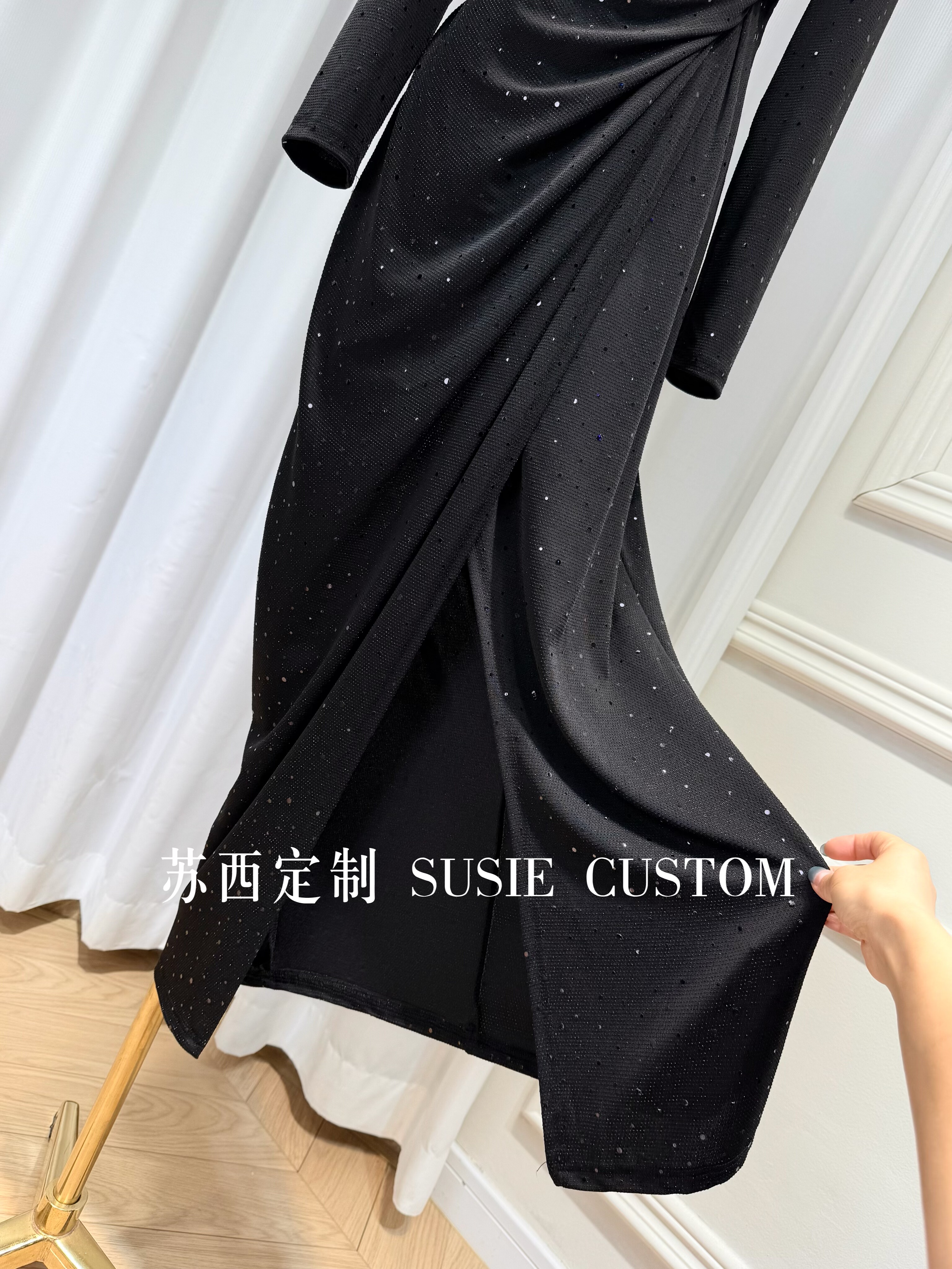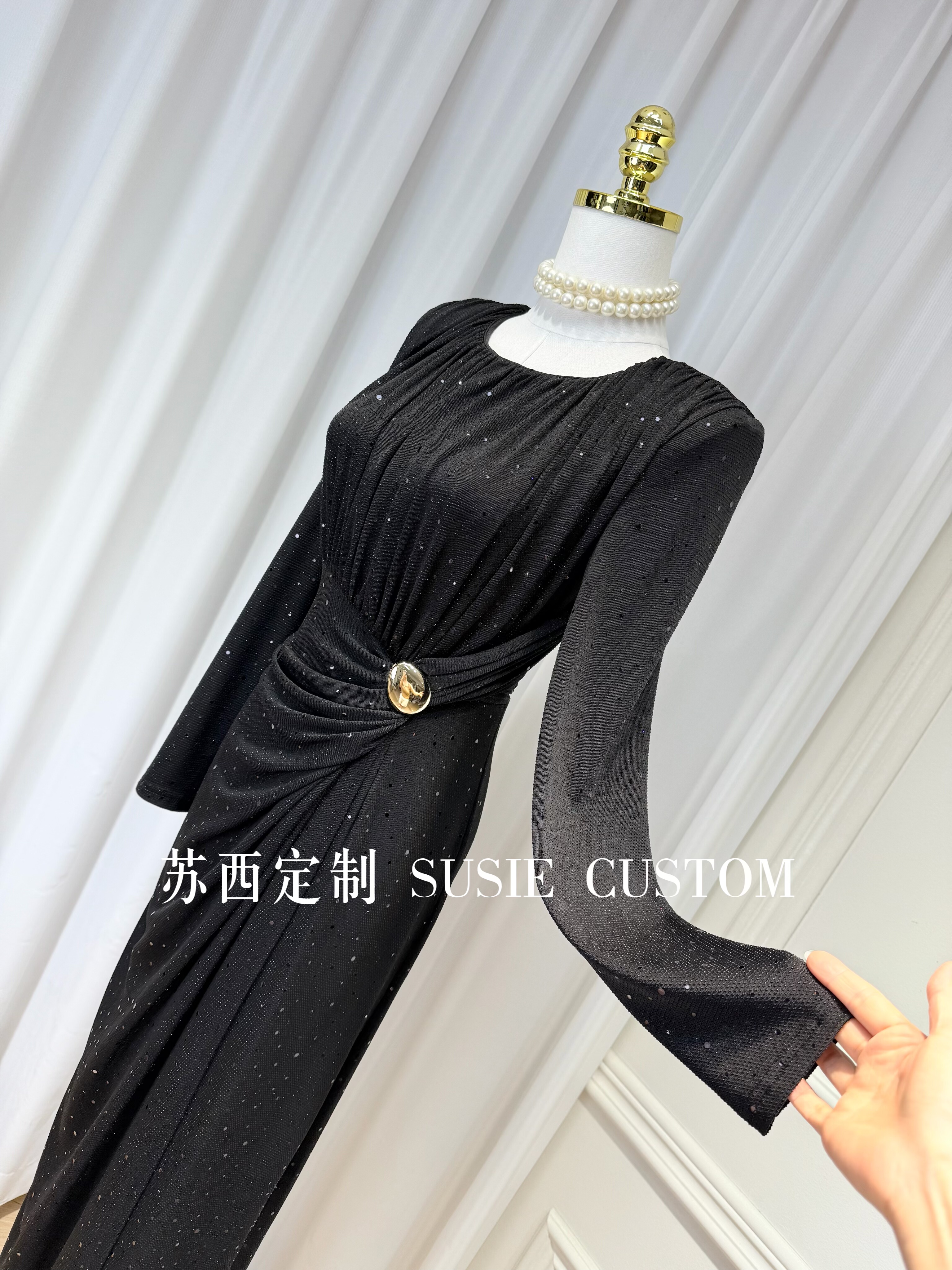 高定气质垫肩金属扣收腰闪闪两片褶皱开叉修身长裙女人味礼服裙