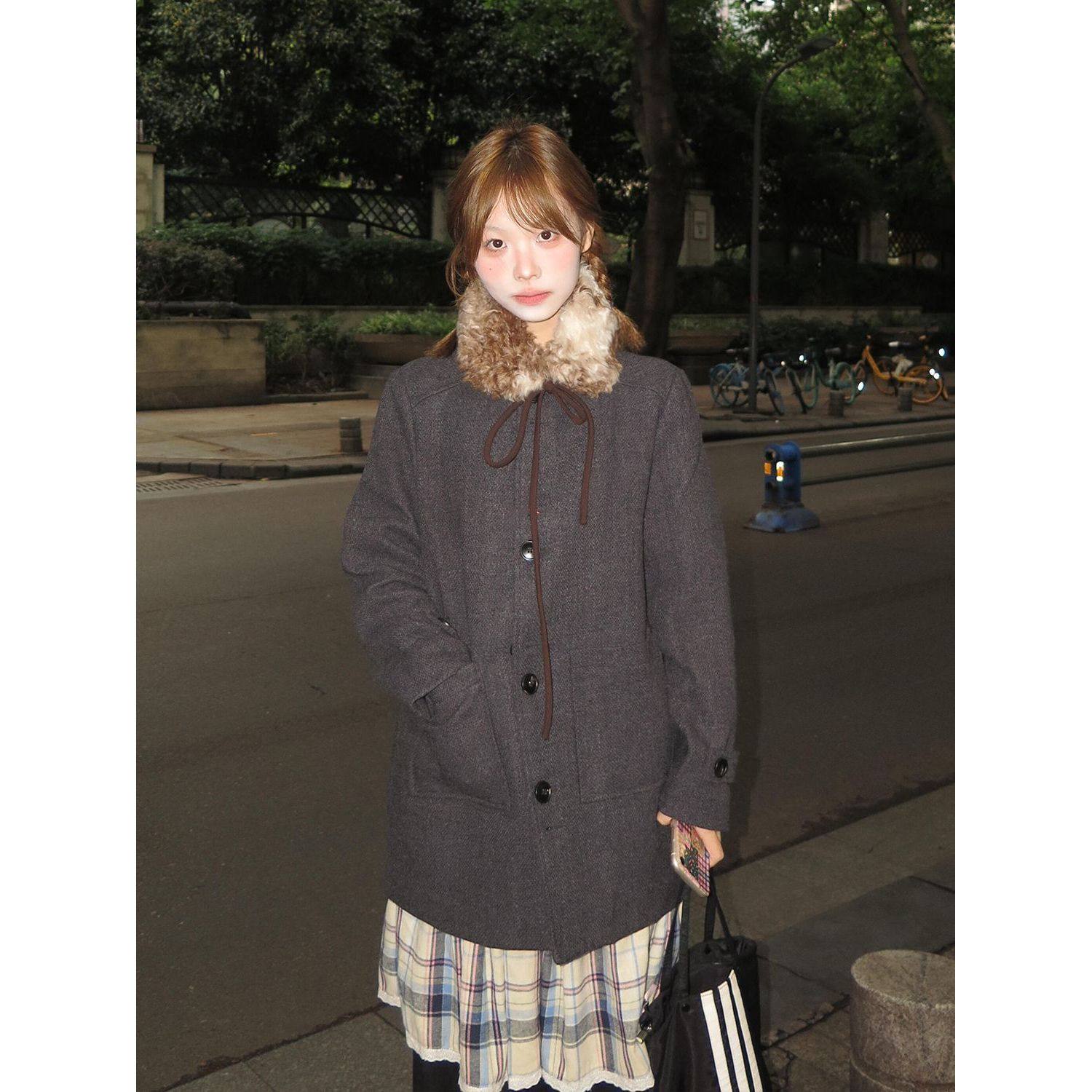 首页> 女装> 复古深灰可拆卸毛领毛呢大衣女秋冬新款百搭设计感中长款呢子外套