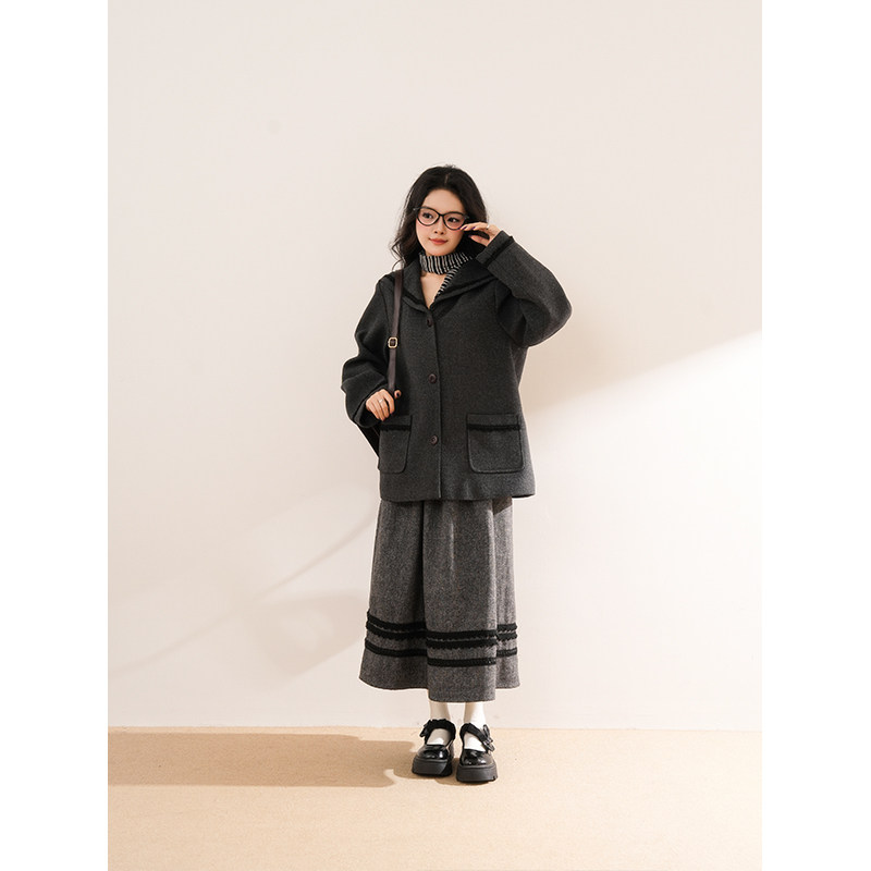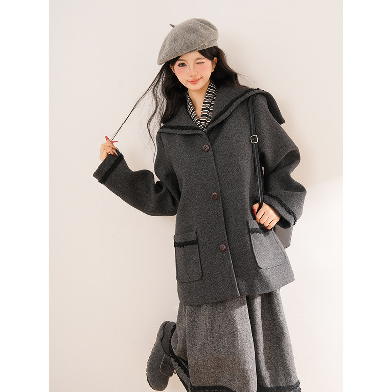 "苍山赴雪" 灰色海军领毛呢大衣+灰色半身裙学院风减龄两件套套装