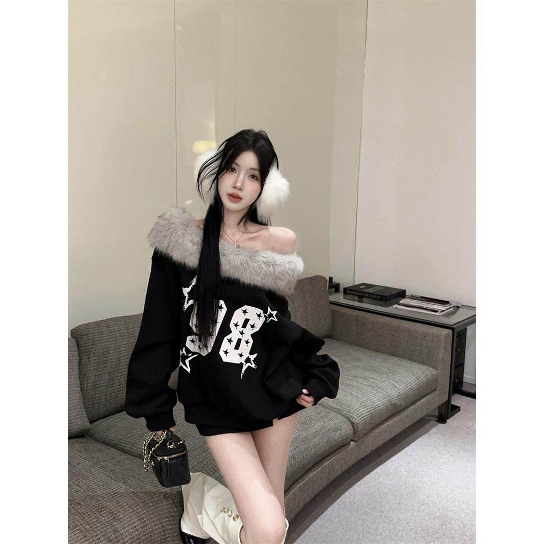 实价实拍~美式复古辣妹设计感毛领斜肩卫衣冬季宽松慵懒短款上衣