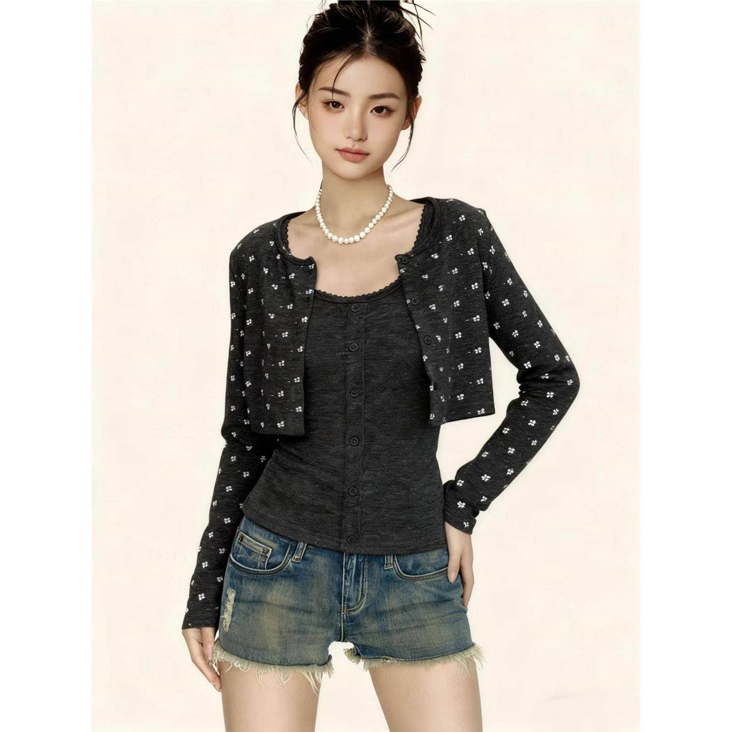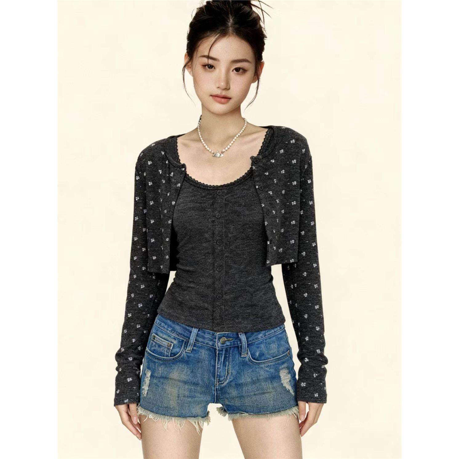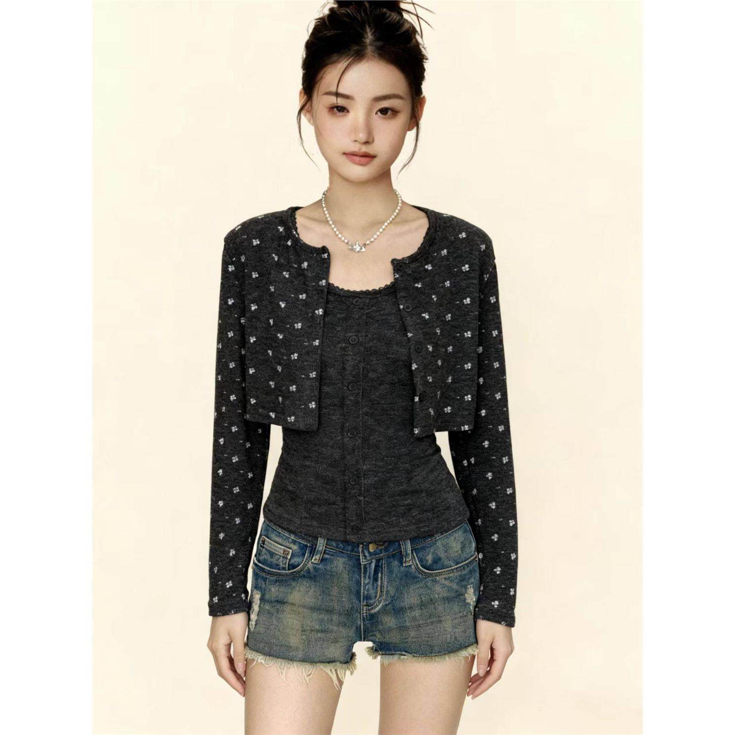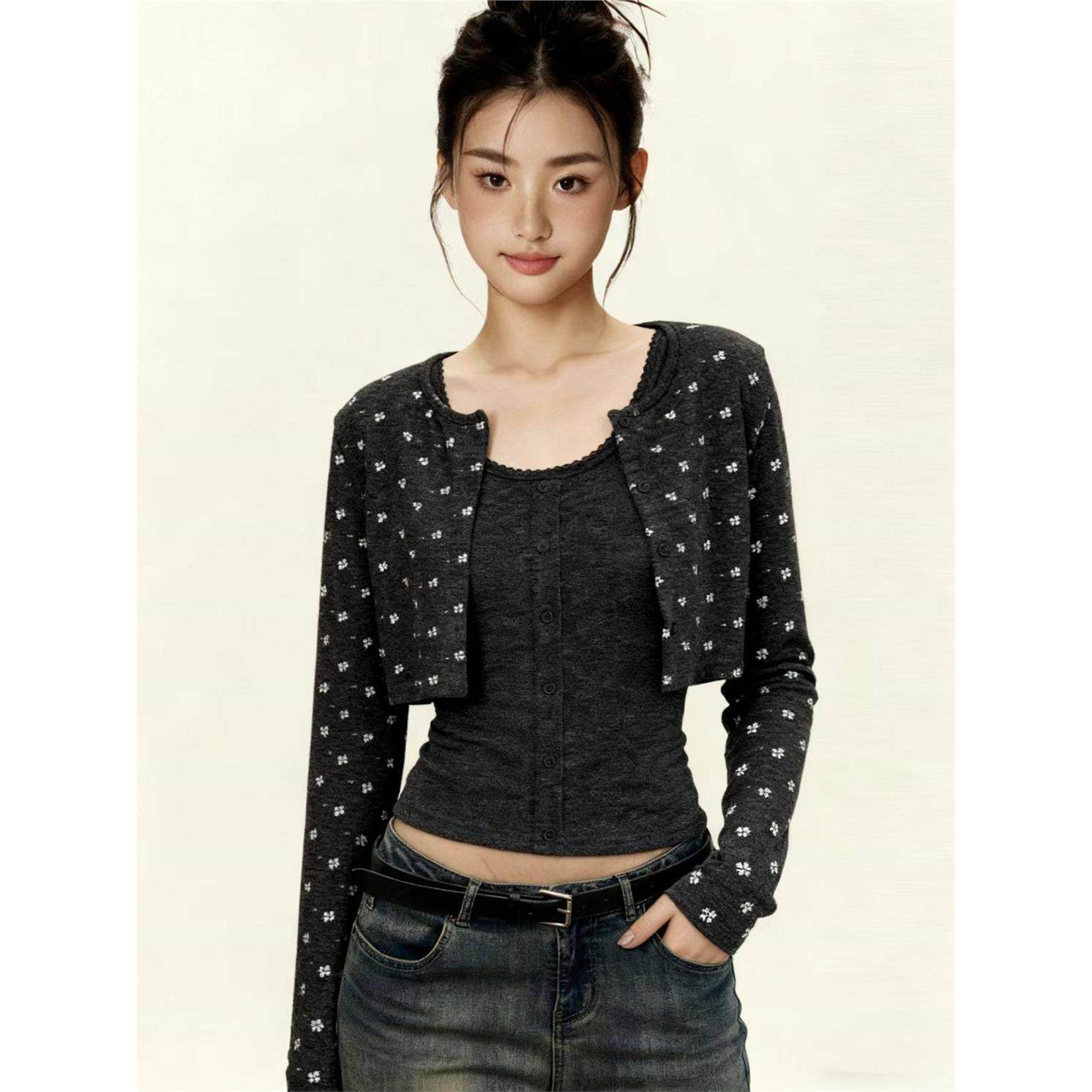 hello nana碎花短款针织开衫外套修身显瘦背心休闲秋季两件套装女