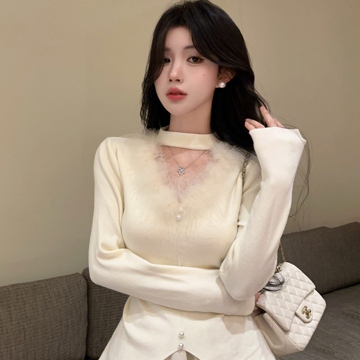 实拍实价 毛茸茸挂脖镂空针织衫女2025秋冬新款不规则毛衣上衣