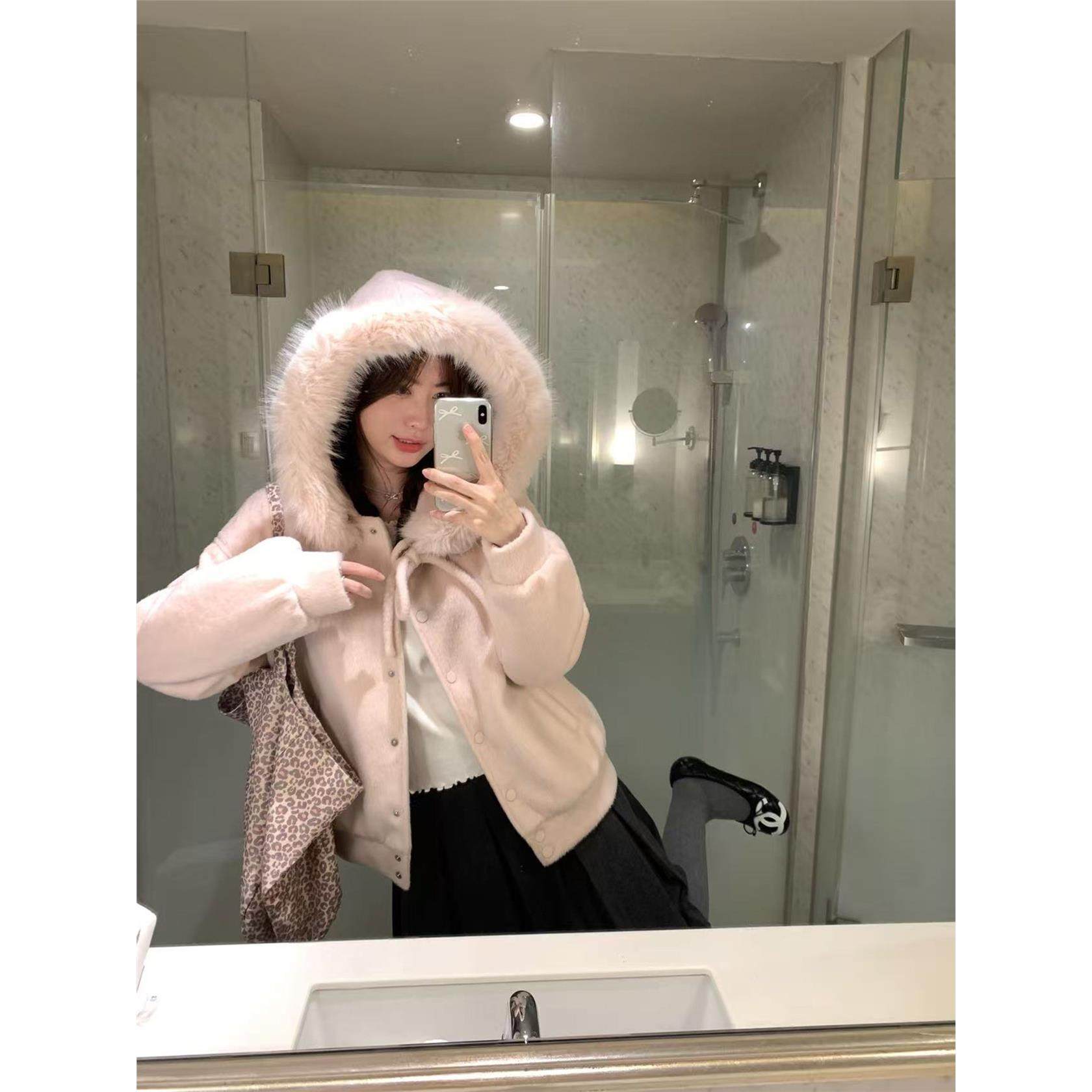 燕麦暖绒蝴蝶结绑带毛领连帽毛呢厚外套女冬季加厚高级感棉服冬装
