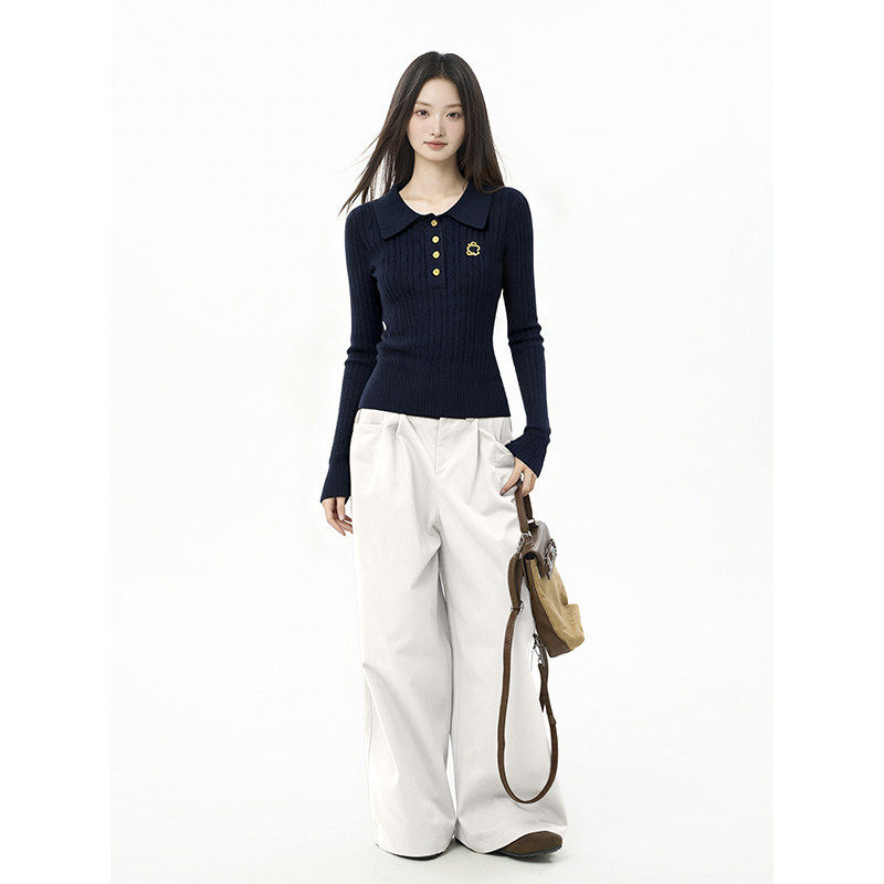 iiiamX藏蓝色正肩polo领针织衫上衣女秋冬季内搭修身翻领打底毛衣