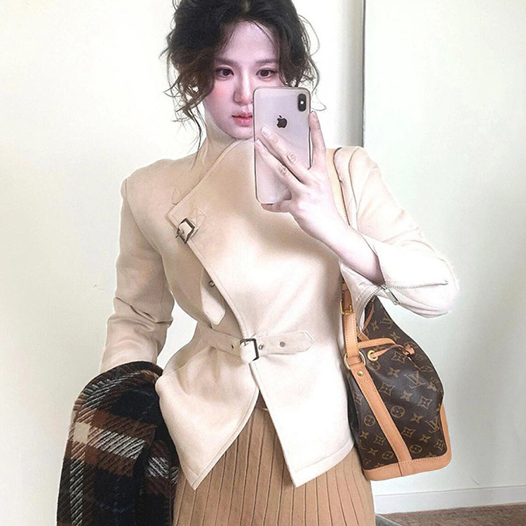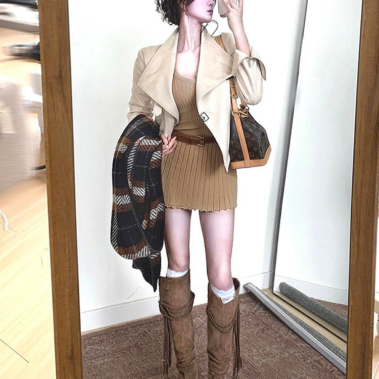 韩系复古慵懒松弛感气质巴恩风杏色立领短外套+连衣裙套装女秋季