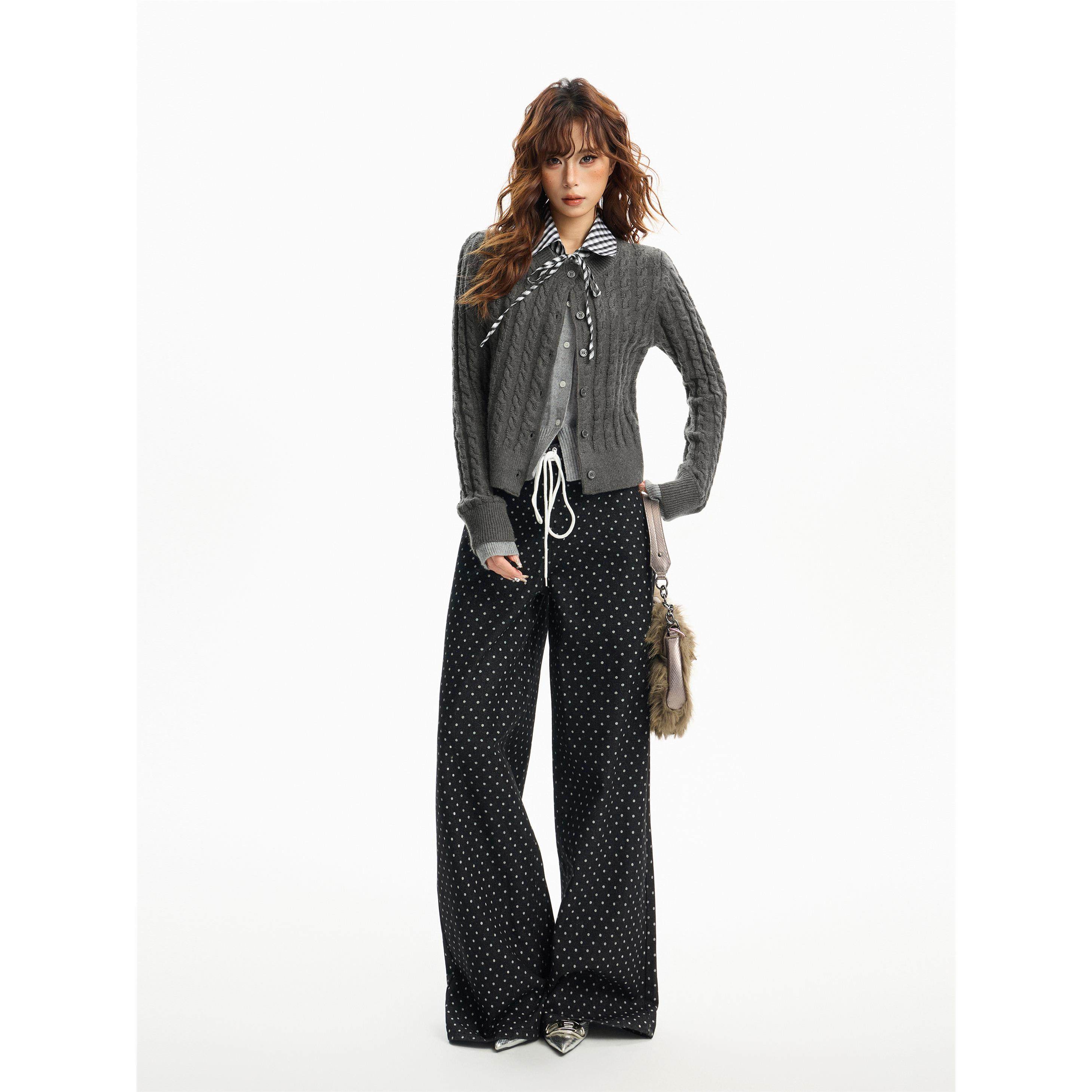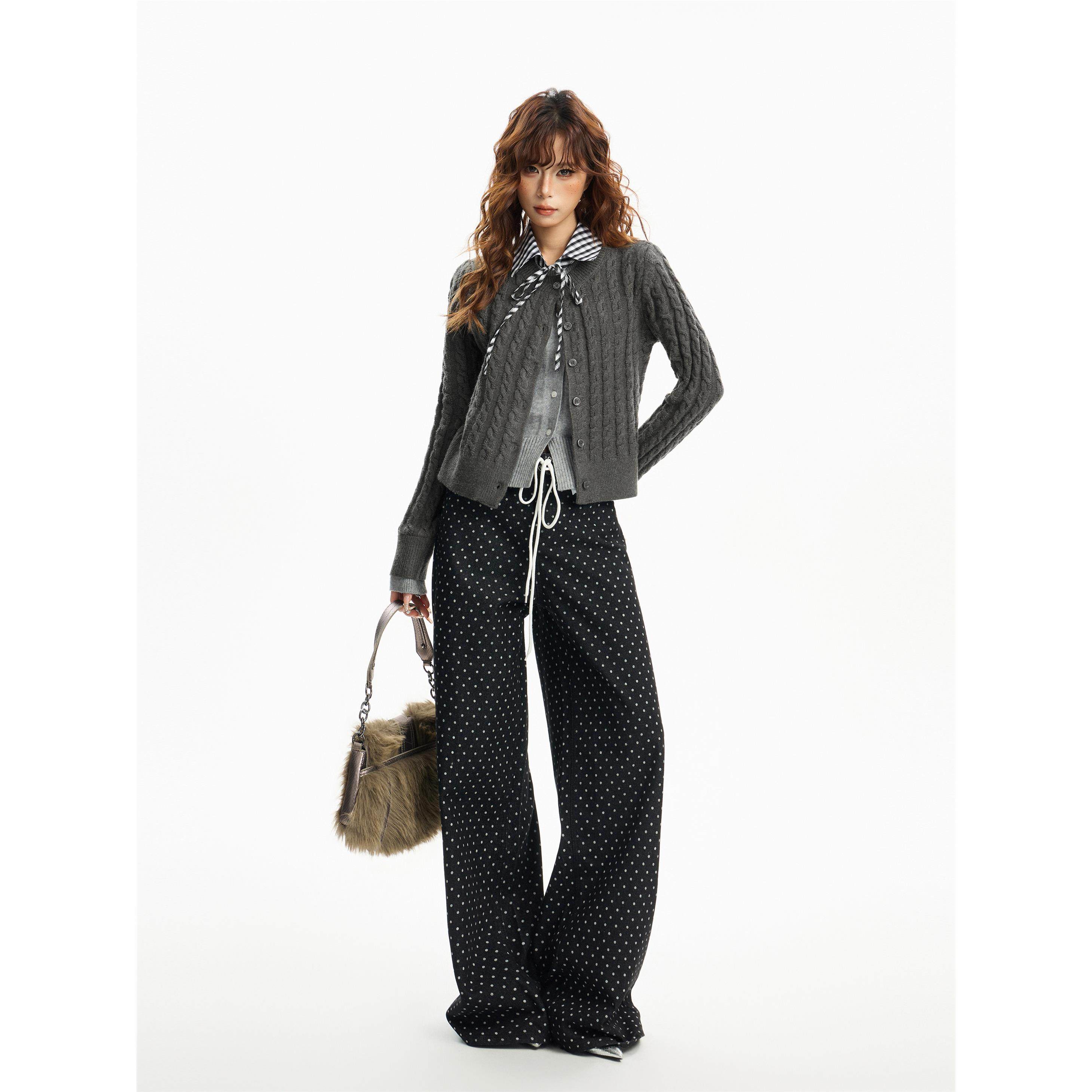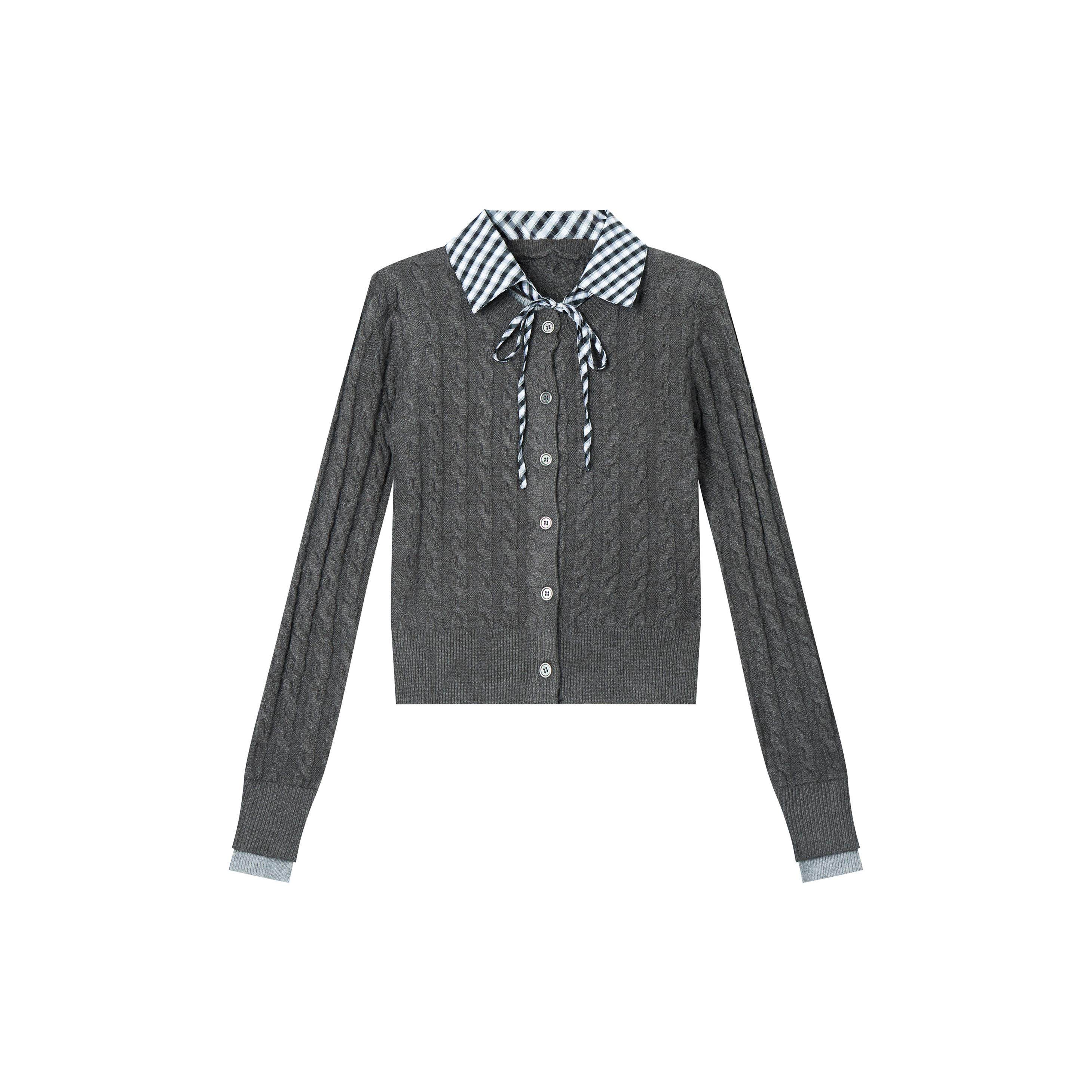 美式灰色麻花polo领假两件毛衣外套女秋冬季宽松短款针织开衫上衣