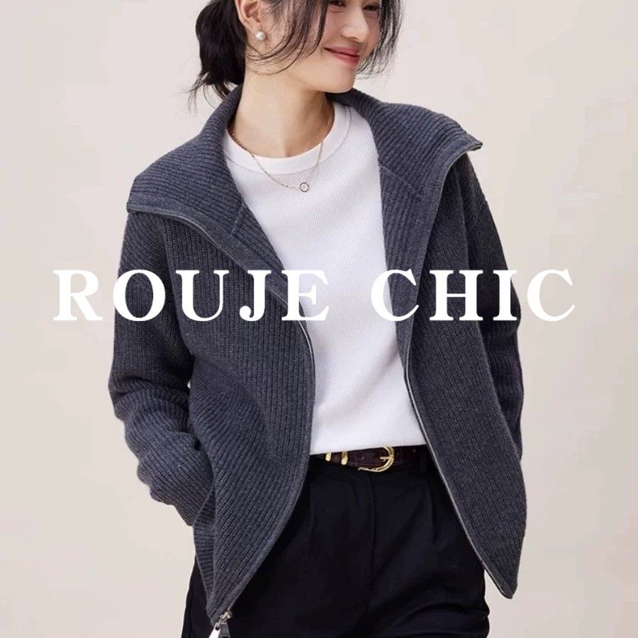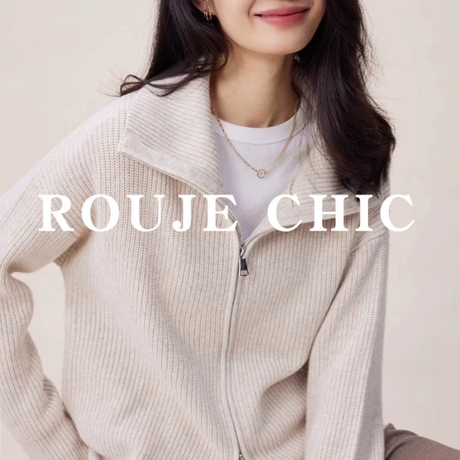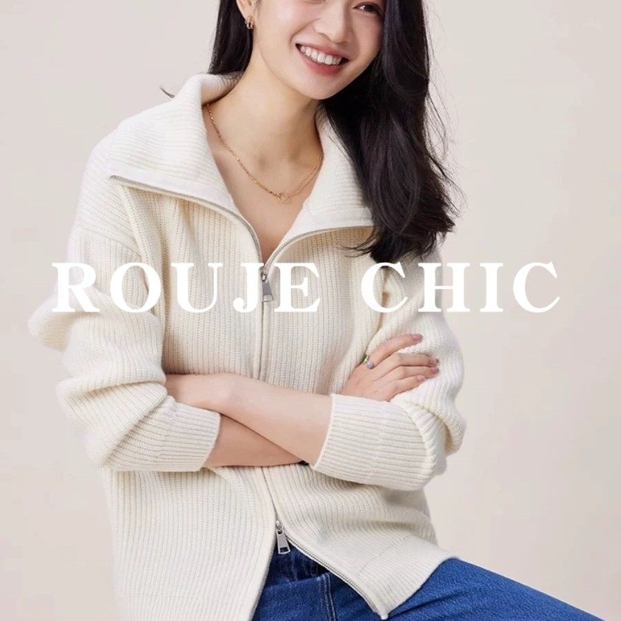 法国rouje chic新年红红色翻领双拉链毛衣外套女高级感羊绒针织衫