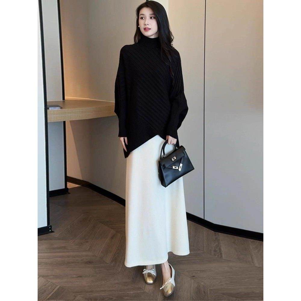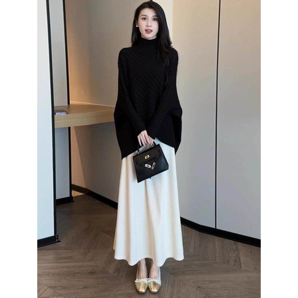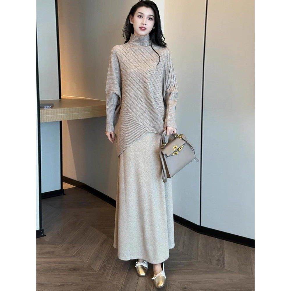 香港代购时尚套装裙女秋冬新款宽松蝙蝠袖针织衫半身裙气质两件套