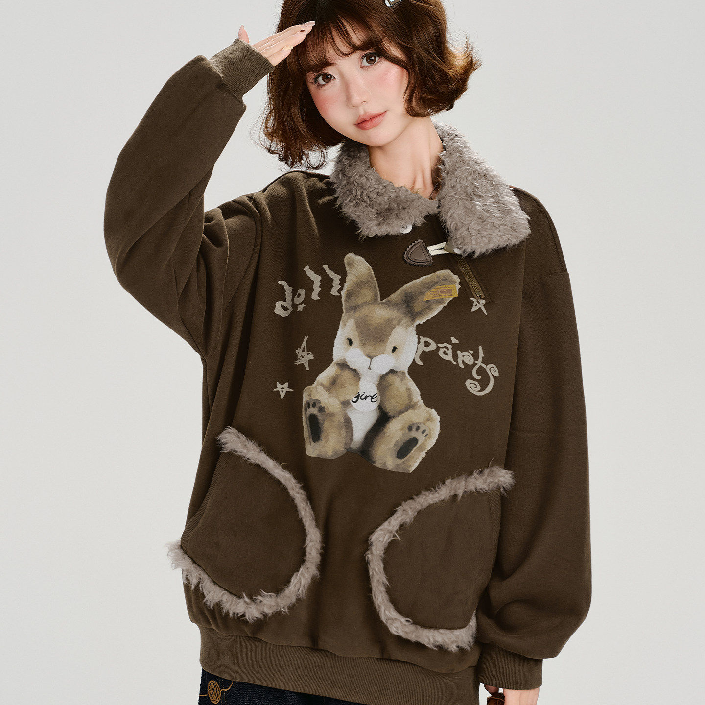 美式复古印花连帽宽松毛领翻领卫衣2025年冬新款上衣套头加绒无帽