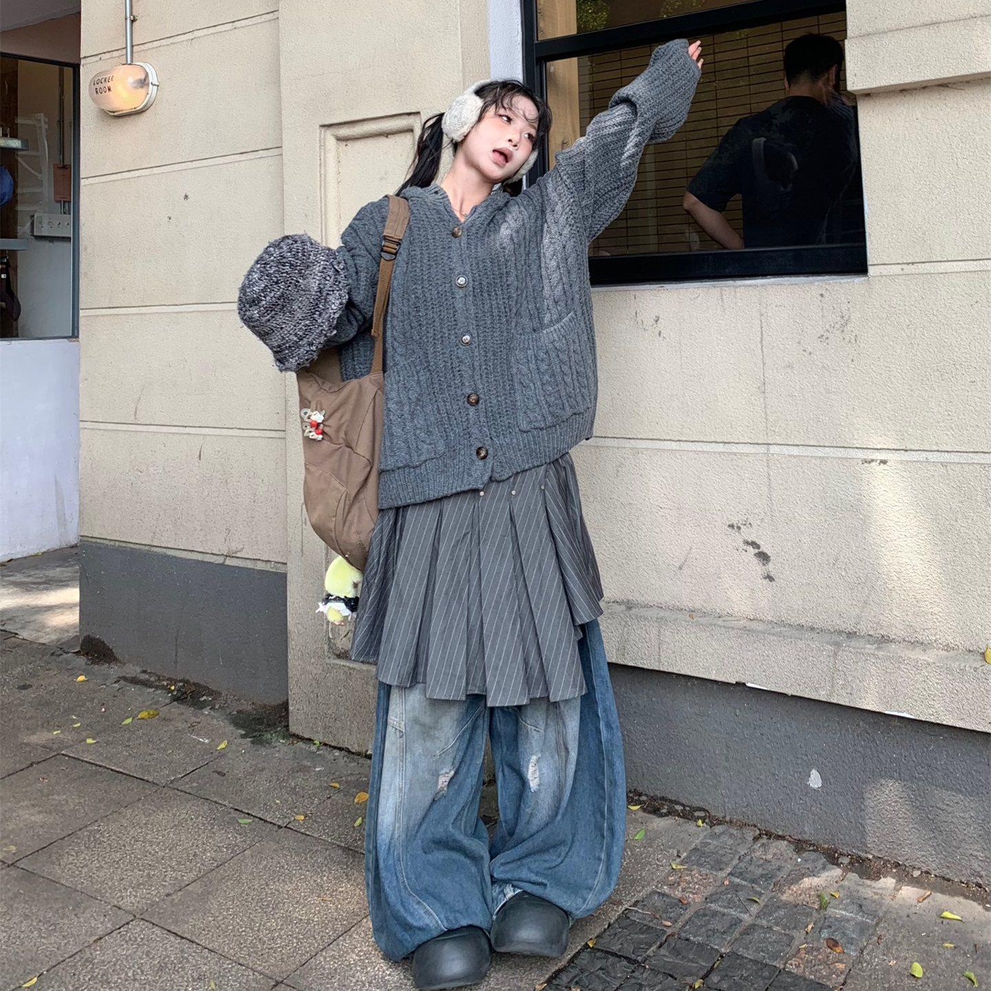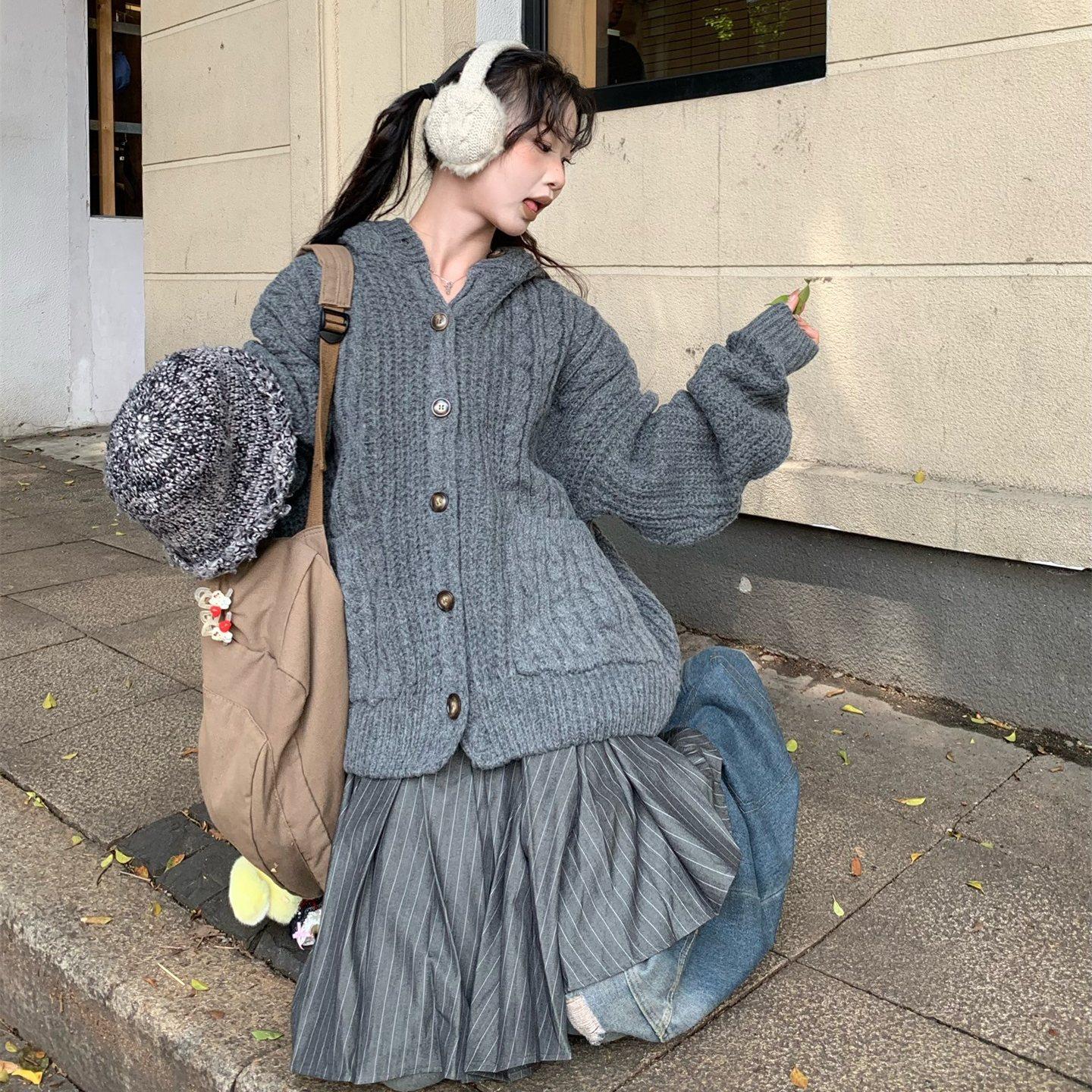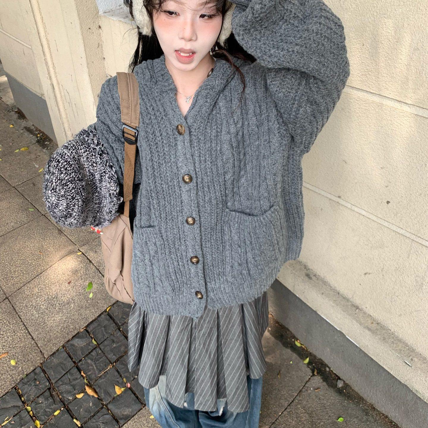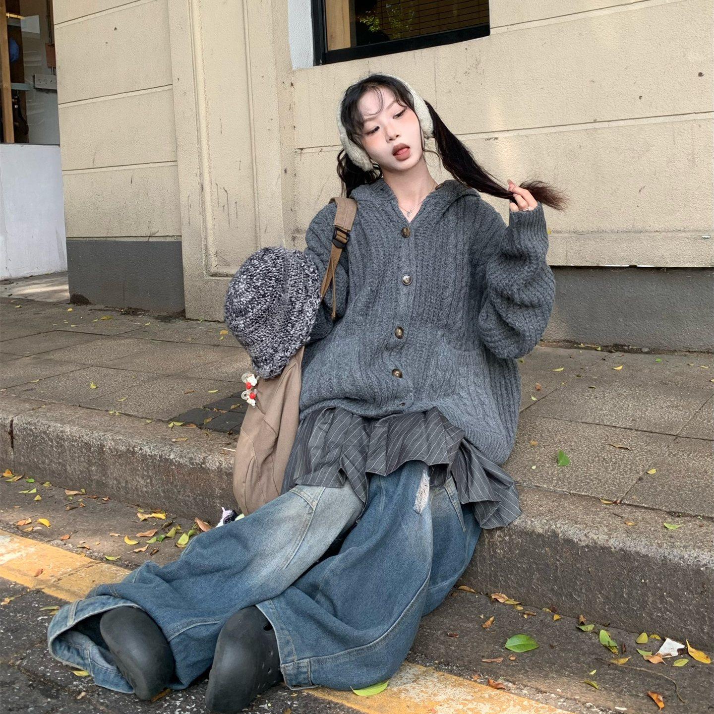 0818很秀 韩系慵懒风V领连帽针织毛衣女秋冬新款美式宽松显瘦外套