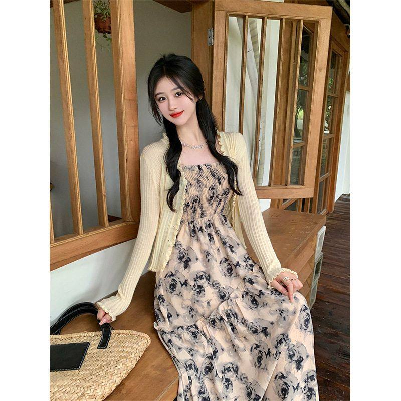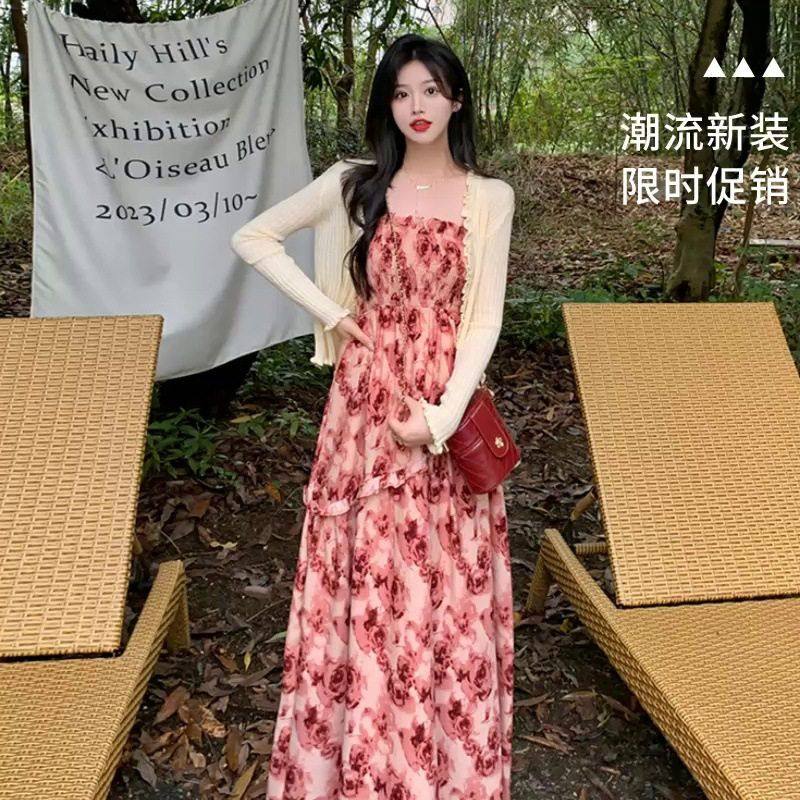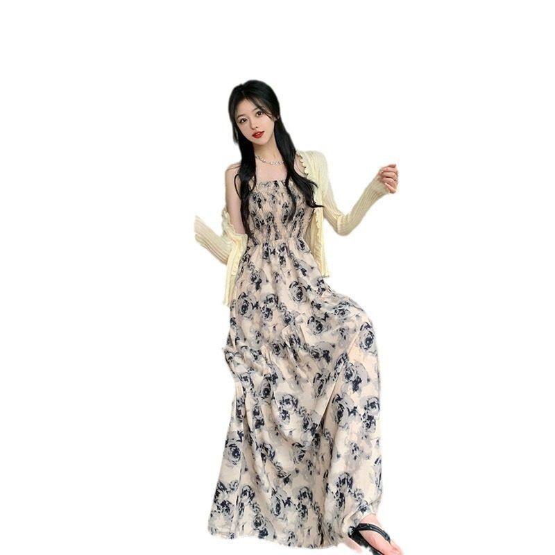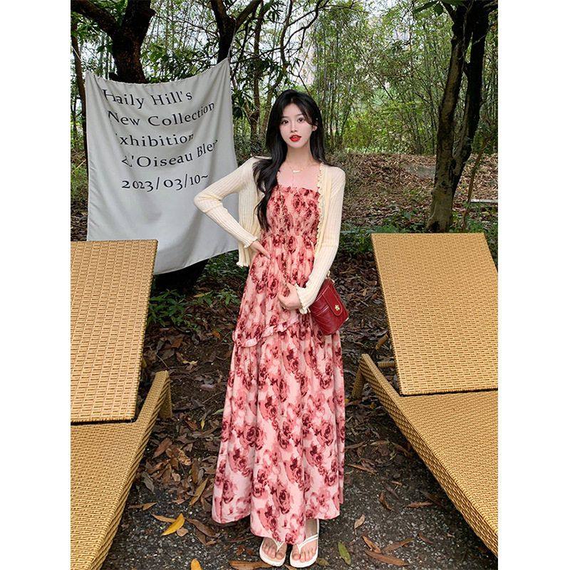 玫瑰碎花吊带连衣裙女夏季2024新款法式收腰显瘦名媛仙女气质长裙