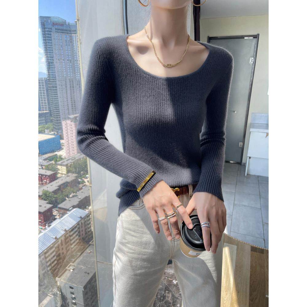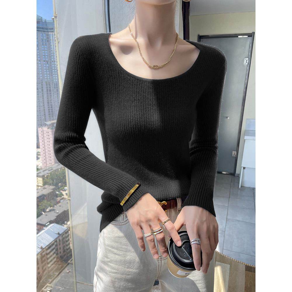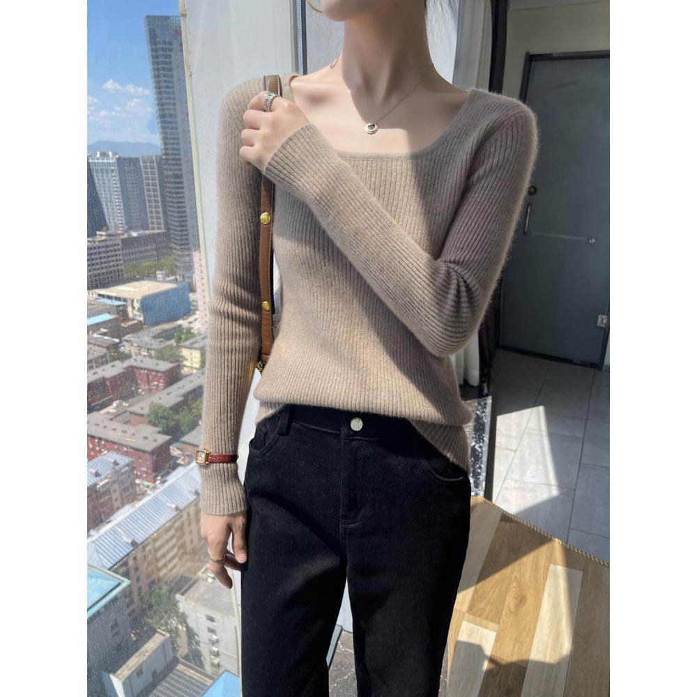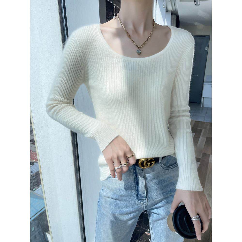 100%纯羊毛衫女低圆领性感小众设计毛衣秋冬新款针织羊毛打底内搭
