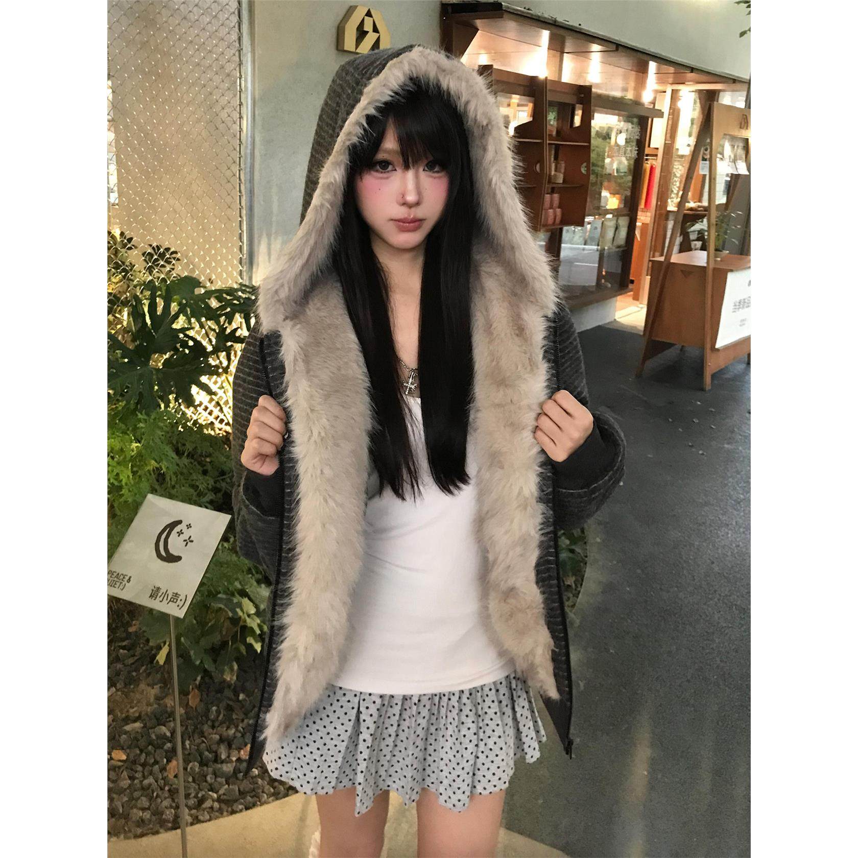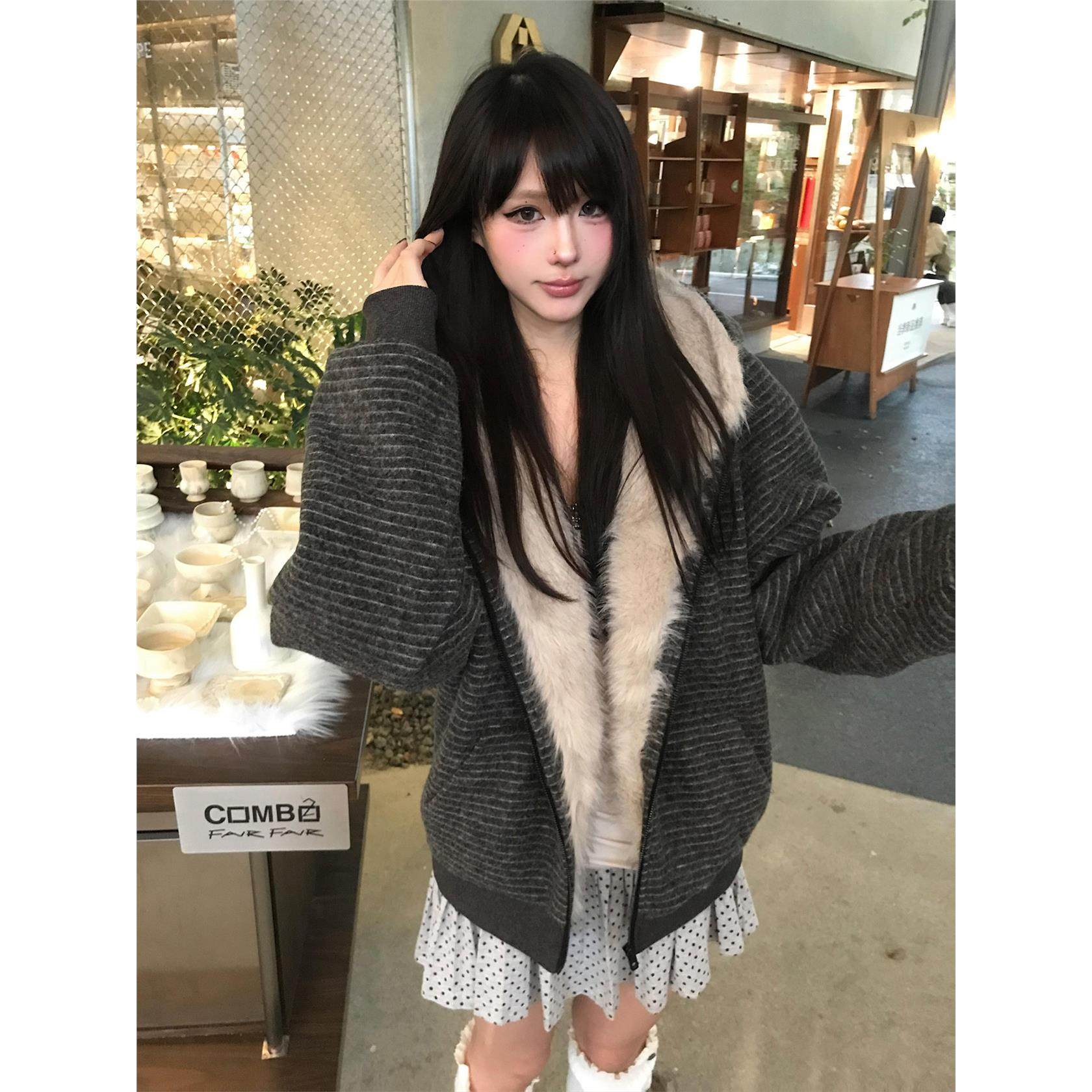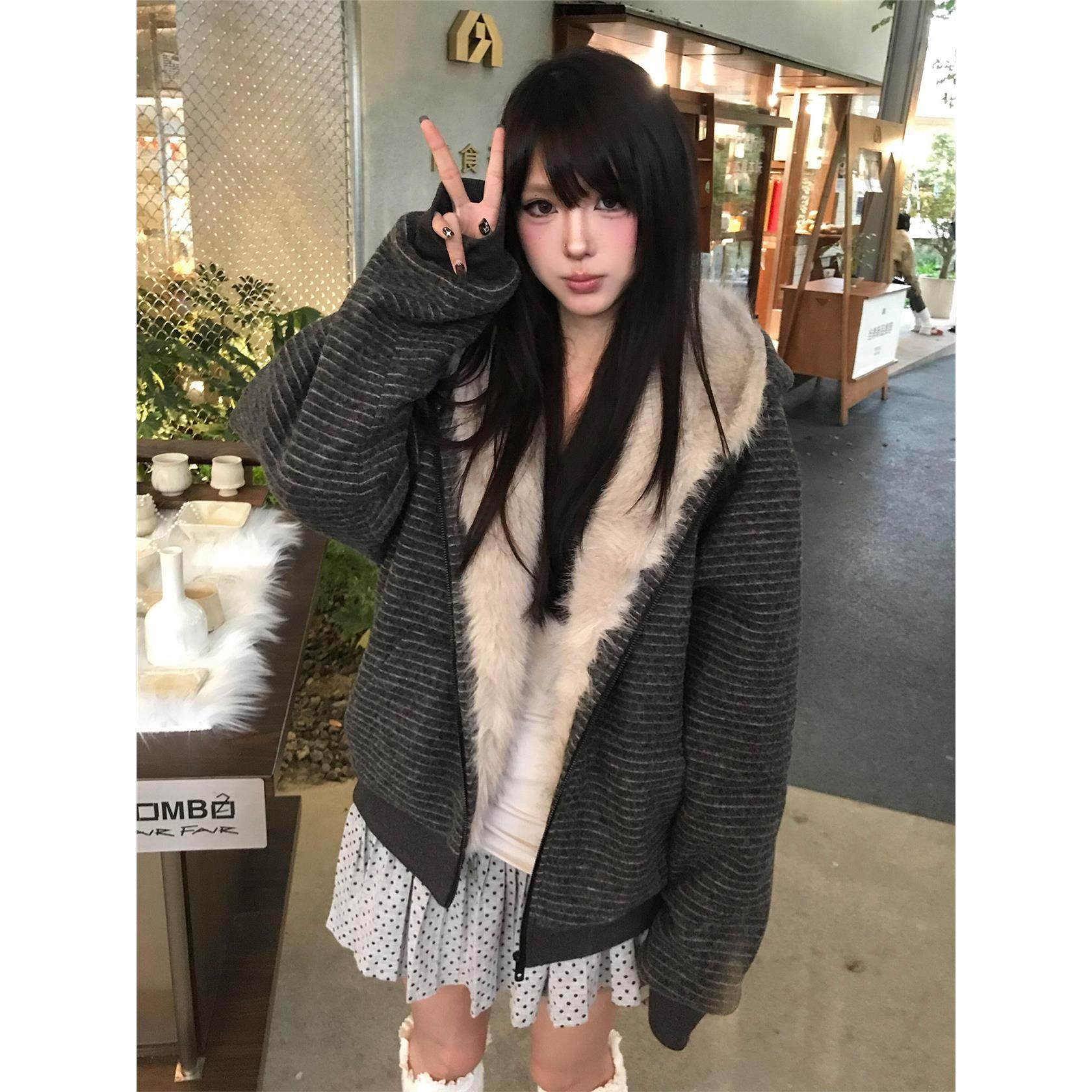 美式座山雕毛领外套女冬季新款加绒加厚条纹连帽卫衣开衫重磅上衣