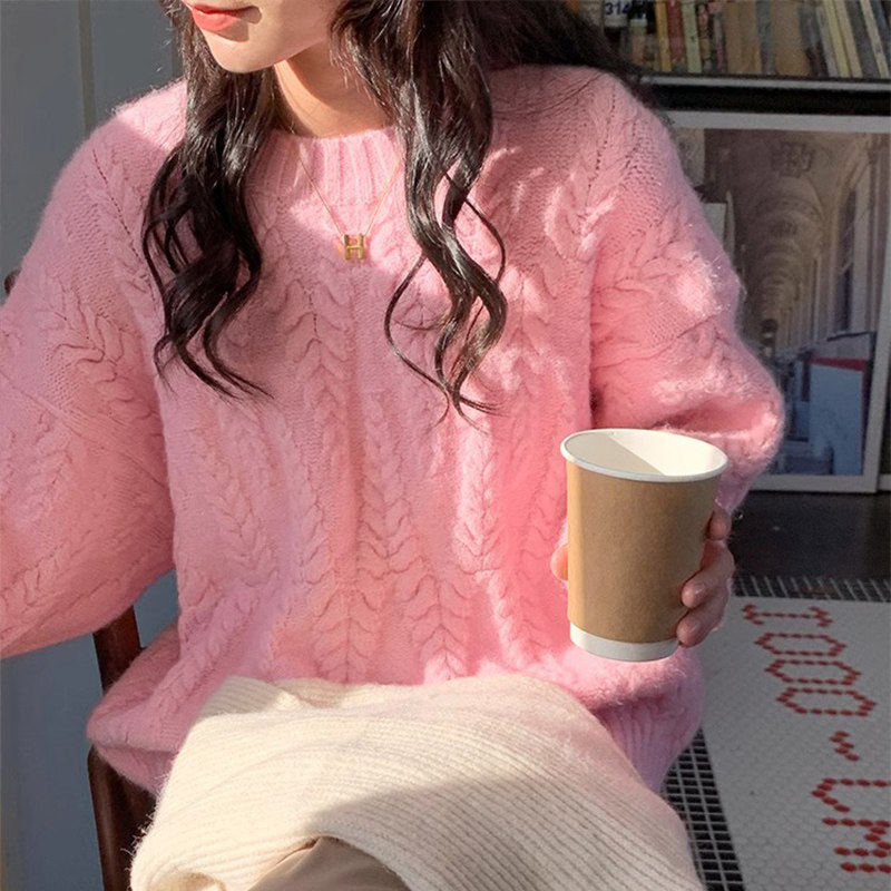 蓝色麻花毛衣女秋冬小个子宽松慵懒风内搭打底针织衫加厚圆领上衣