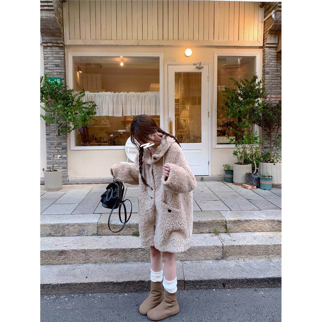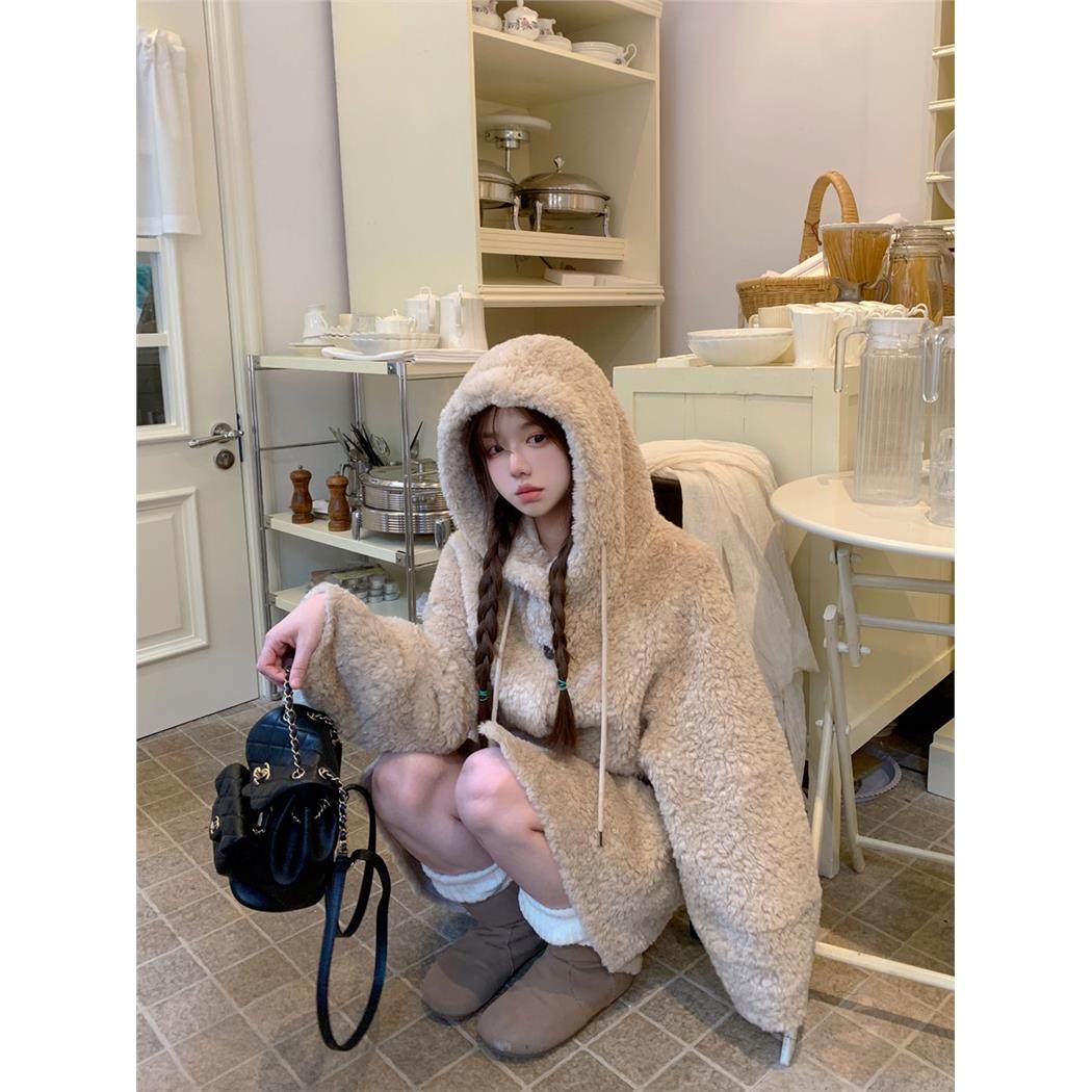 布朗小熊女冬皮草中长款皮毛一体羊羔毛大衣韩系宽松毛绒连帽外套