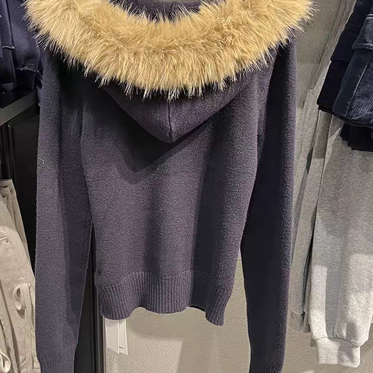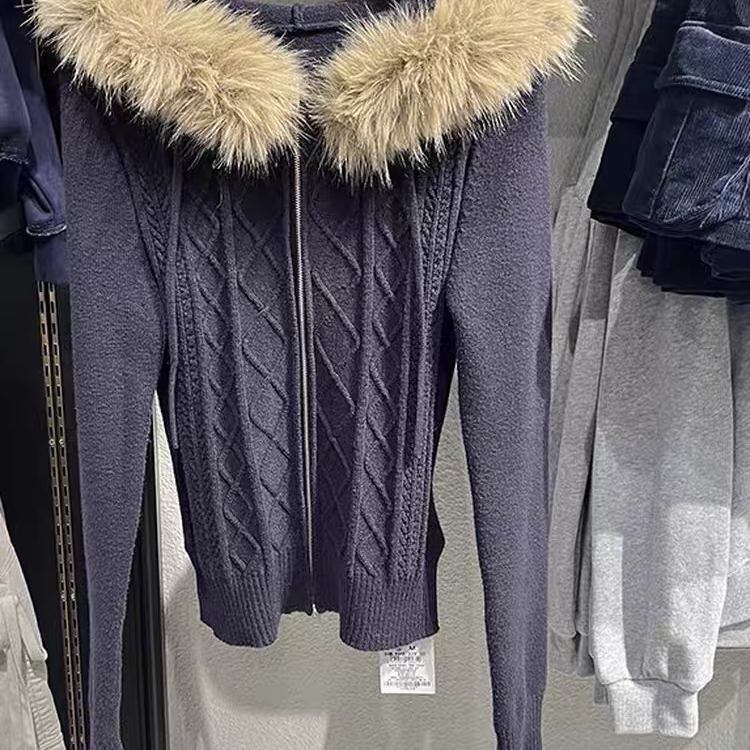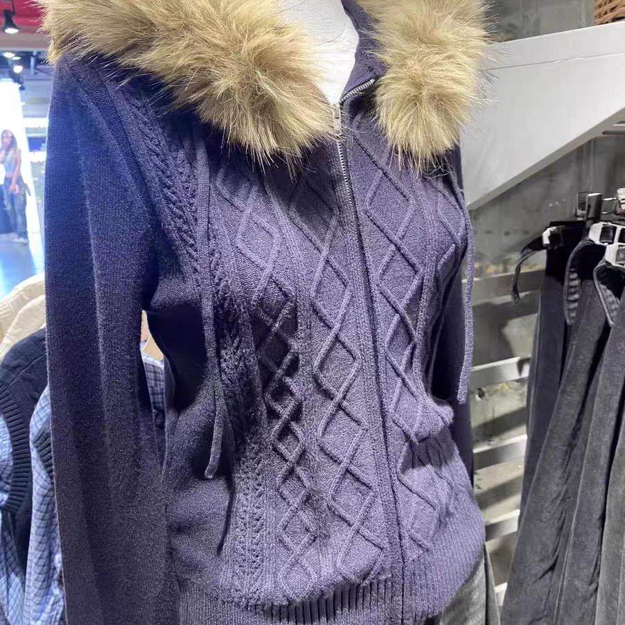 WM美式复古毛领拉链针织开衫女深蓝色麻花纹毛衣外套长袖女秋冬