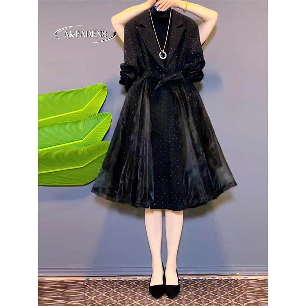 香港胖女孩轻奢赫本风格加码妇女腰拼接网眼中等长度黑色泡芙裙