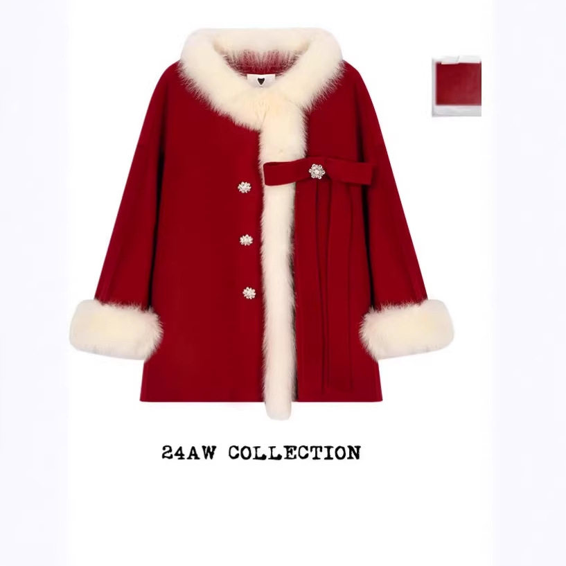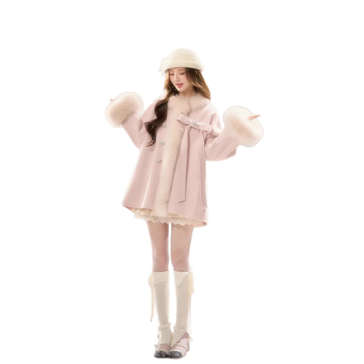 雪国千金真狐狸毛皮草双面羊毛呢子大衣蝴蝶结斗篷外套女小个子