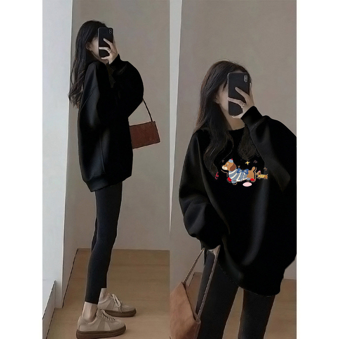 中长款白色加绒卫衣女2025秋冬季新款套头宽松遮屁股卡通印花上衣